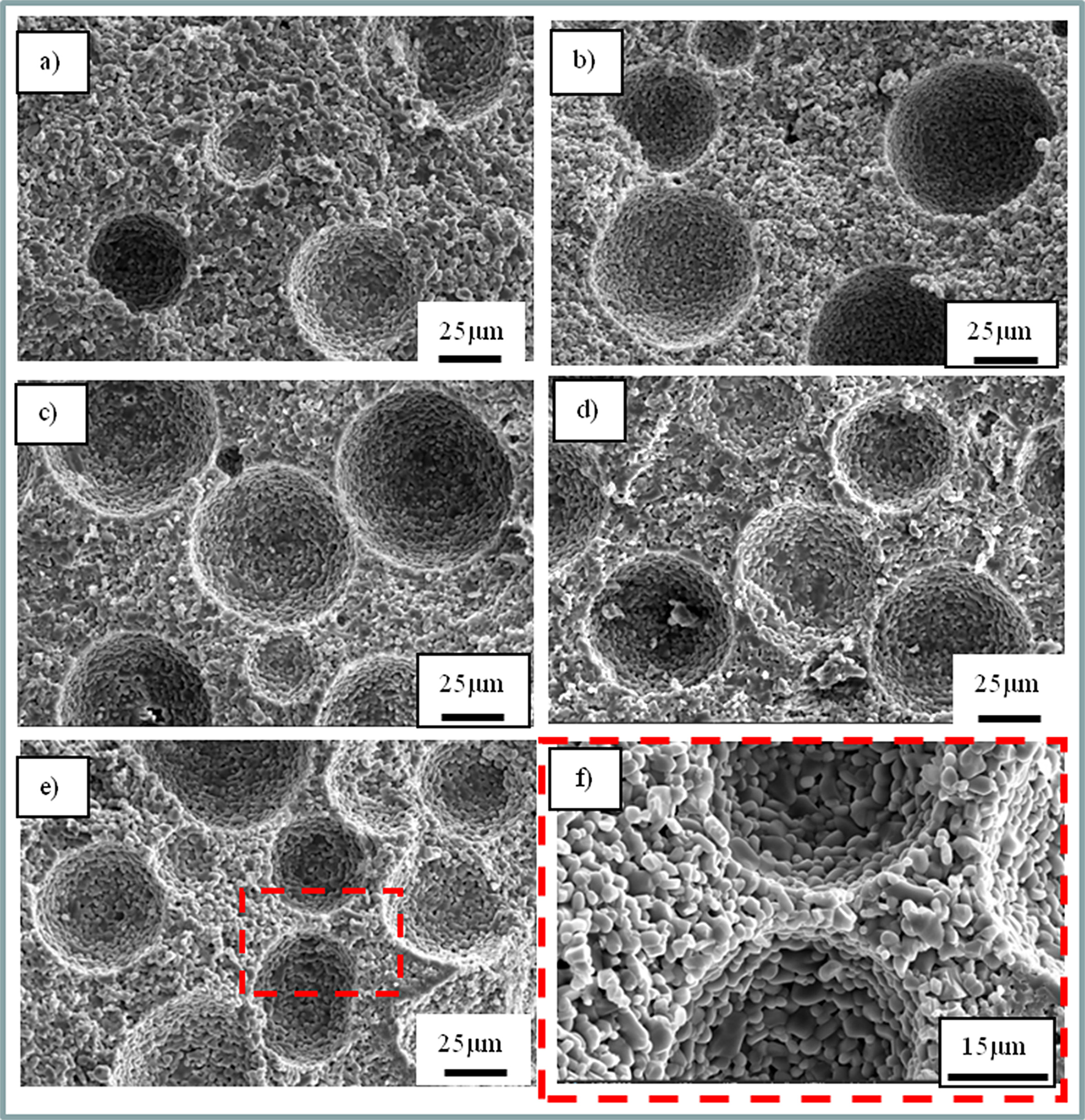 Fig. 1 SEM diagrams of porous alumina ceramics with different pore-forming agent contents. The SEM maps of porous alumina with 10, 20, 30, 40 and 50 vol% pore-forming agent content are (a), (b), (c), (d) and (e) respectively, and (f) a local enlargement of figure (e). |