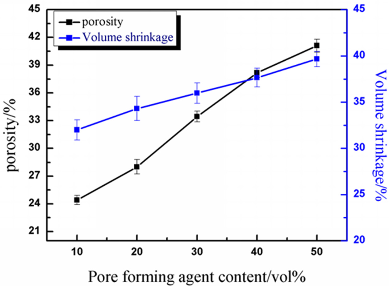 Fig. 2 Effect of different pore forming agent contents on porosity and volume shrinkage. |