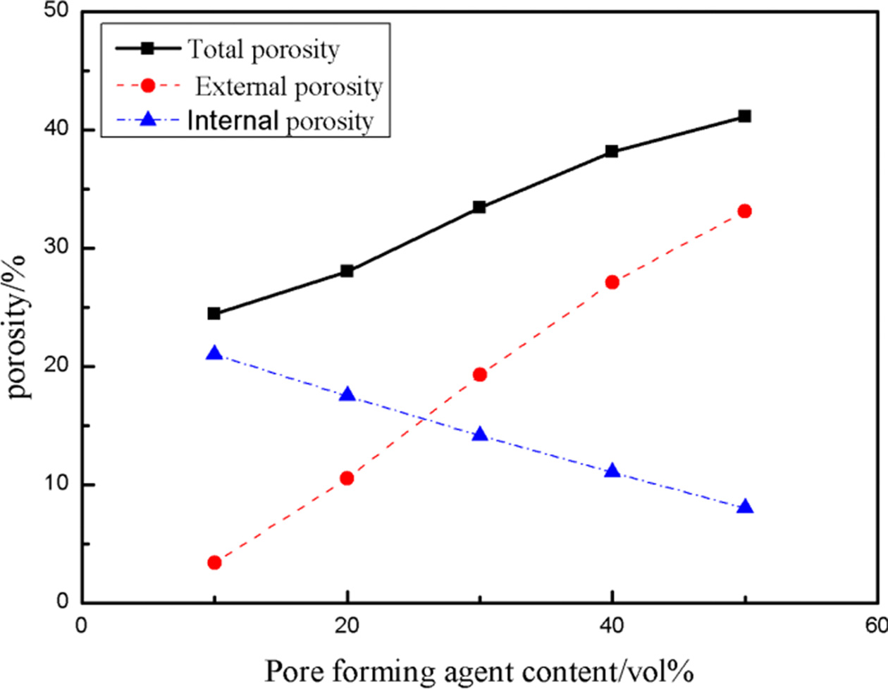 So as to research the effect of pores matching on the properties of materials, the internal and external pores of materials with different pore-forming agent addition were estimated. Based on the experimental results [26, 27], the following assumptions are made: (i) the shrinkage of internal pores is not affected by external pores. Internal porosity depends on the effective solid content. (ii) When the effective solid content was the same, the shrinkage caused by sintering of powder particles at the same sintering conditions remained the same. With those assumption, the internal and external porosity can be calculated using the following equation: