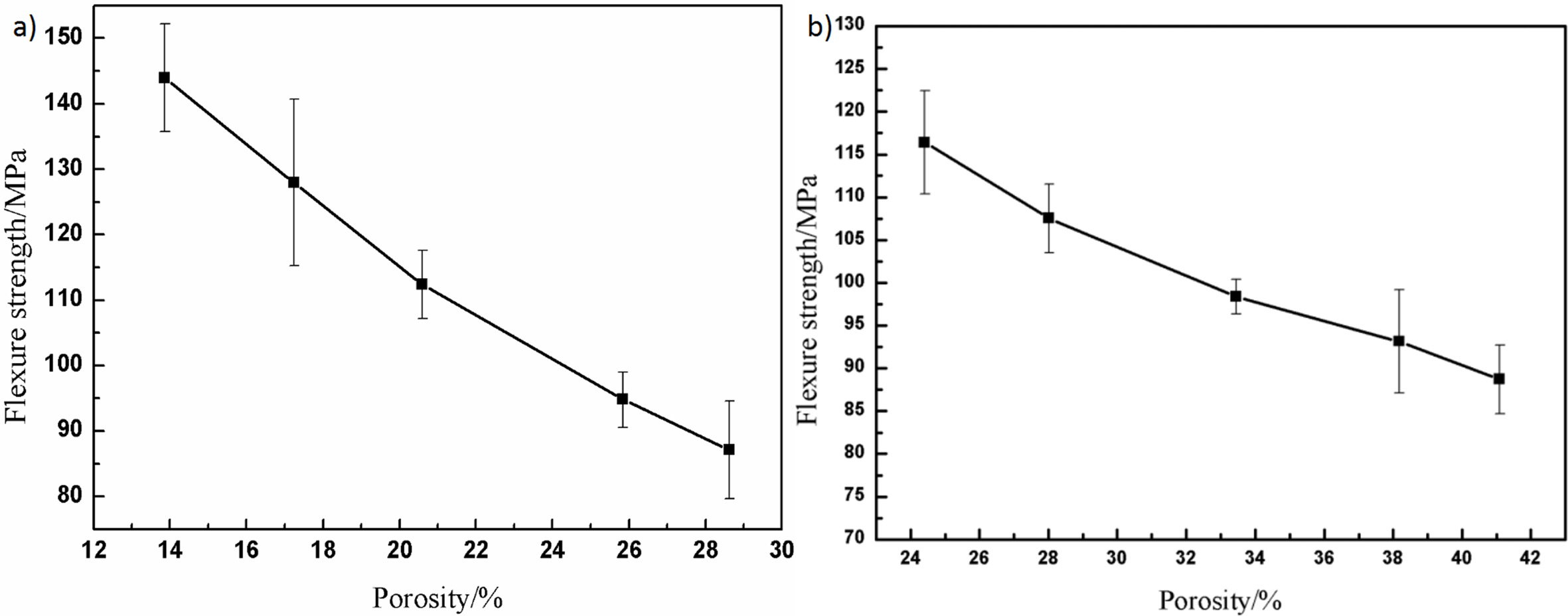 (1) The flexural strength and modulus of elasticity decreased exponentially with the increase of porosity and the dependence of elastic modulus on porosity was greater than that of flexural strength on porosity.