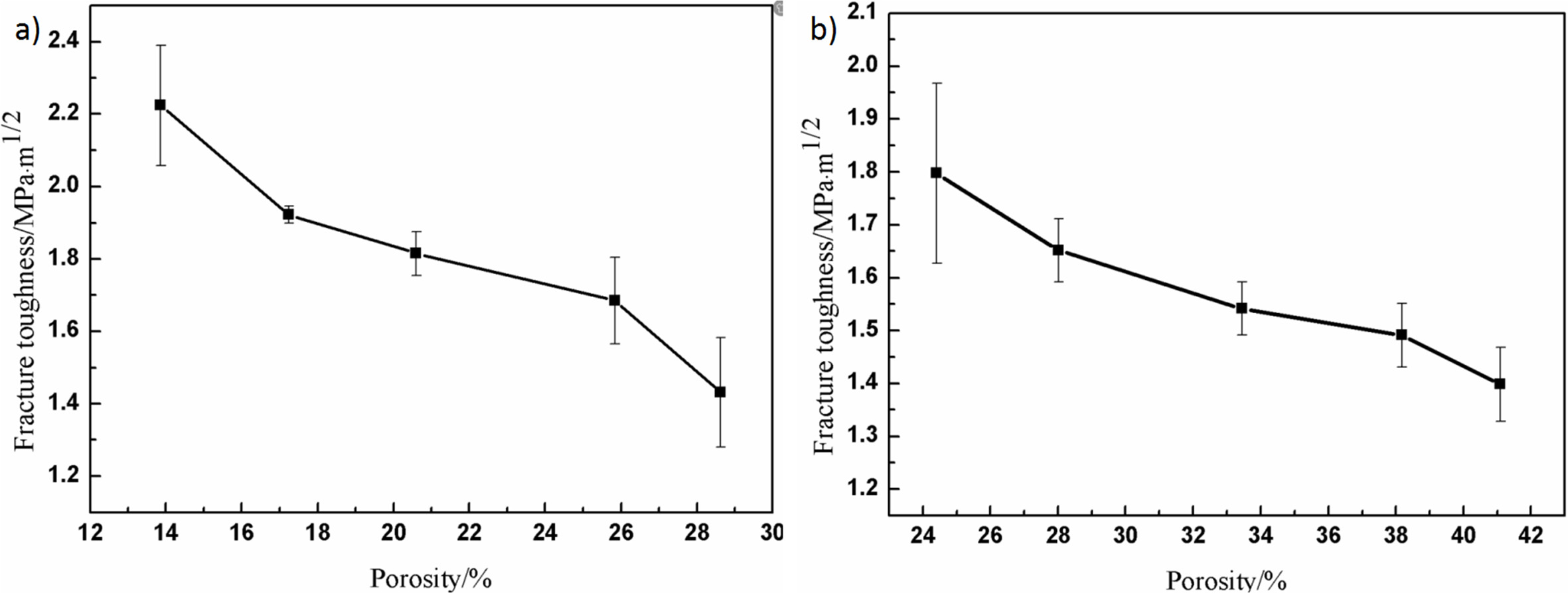 Fig. 6 The relationship between porosity and fracture toughness of porous alumina ceramics: (a) without pore-forming agents; (b) with different contents of pore-forming agents |