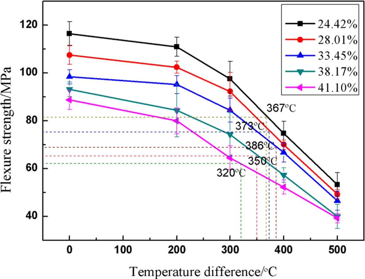 Fig. 8 shows the flexural strength of porous alumina ceramics with different porosity varying with thermal shock temperature. The five broken lines represent the variation of flexural strength of porous alumina ceramics with porosity of 24.42%, 28.01%, 33.45%, 38.17% and 41.10%, respectively. As can be seen from Fig. 8, the flexural strength of alumina ceramics with the same porosity decreased gradually with the increase of thermal shock temperature difference. Under the same thermal shock temperature difference, the flexural strength decreased with the increase of porosity.