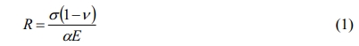 Among them, R' is called the second thermal stress fracture resistance factor, σf is the ultimate strength of the material, rm is the effective thickness of the specimen and h is the heat transfer coefficient of the sample. The critical temperature difference is proportional to the ultimate strength and thermal conductivity of the material and inversely proportional to the elastic modulus. Set (1-ν)/α as the constant a and brought in the numerical value. The results of different porosity were as follows: 21.81a, 23.19a, 23.74a, 22.41a and 21.46a. The calculated results were in excellent agreement with the experimental results. When the porosity was 33.45%, the thermal shock fracture resistance was the best and the critical temperature difference was 386 oC.