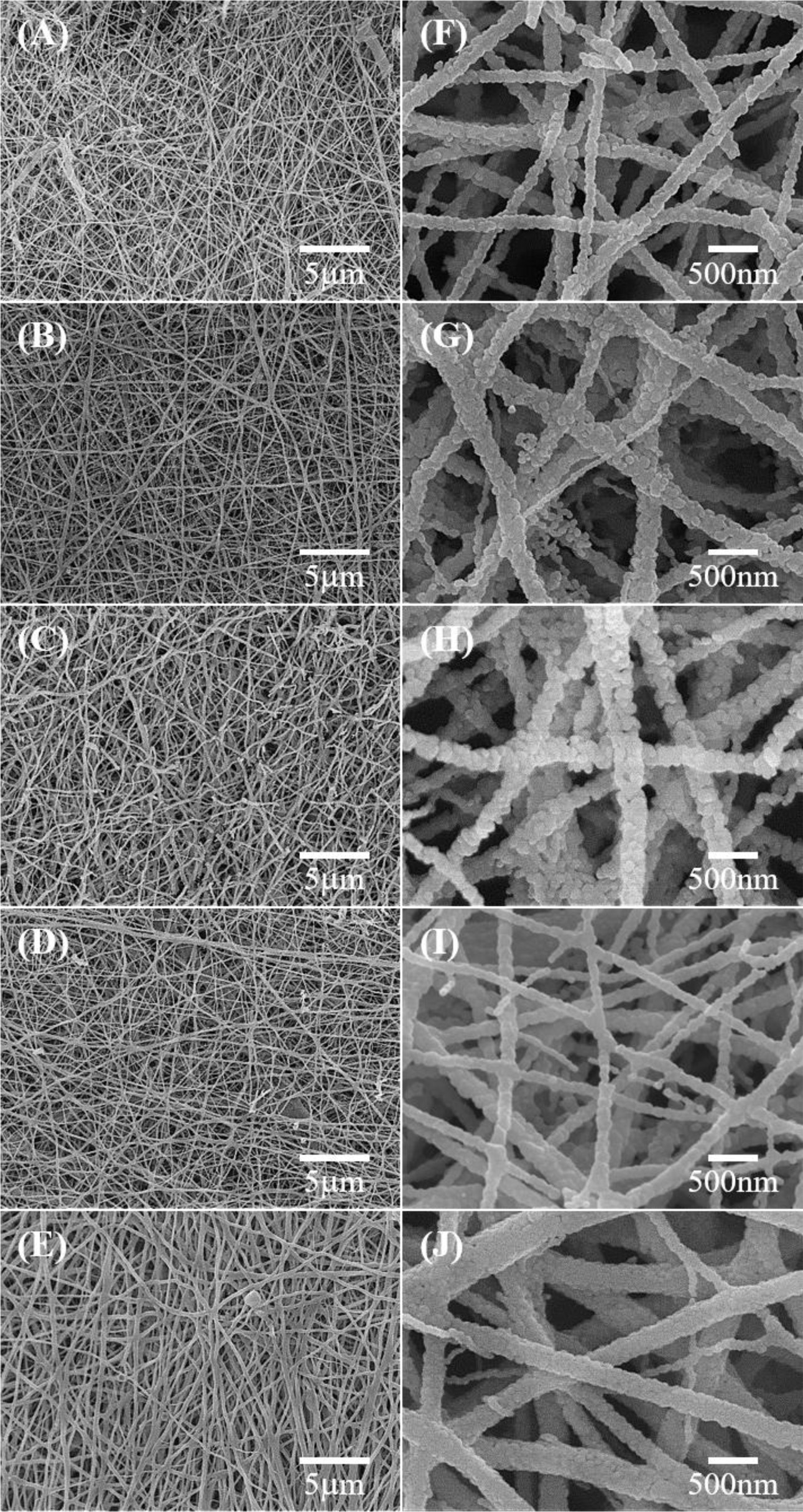Fig. 2 Field emission scanning electron microscopy (FE-SEM) images of the nanofibers calcined at 500 ? for 3h: (A, F) ZA-0 (0 at% Ag), (B, G) ZA-1.0 (1.0 at% Ag), (C, H) ZA-1.5 (1.5 at% Ag), (D, I) ZA-2.0 (2.0 at% Ag), and (E, J) ZA-2.5 (2.5 at% Ag). |