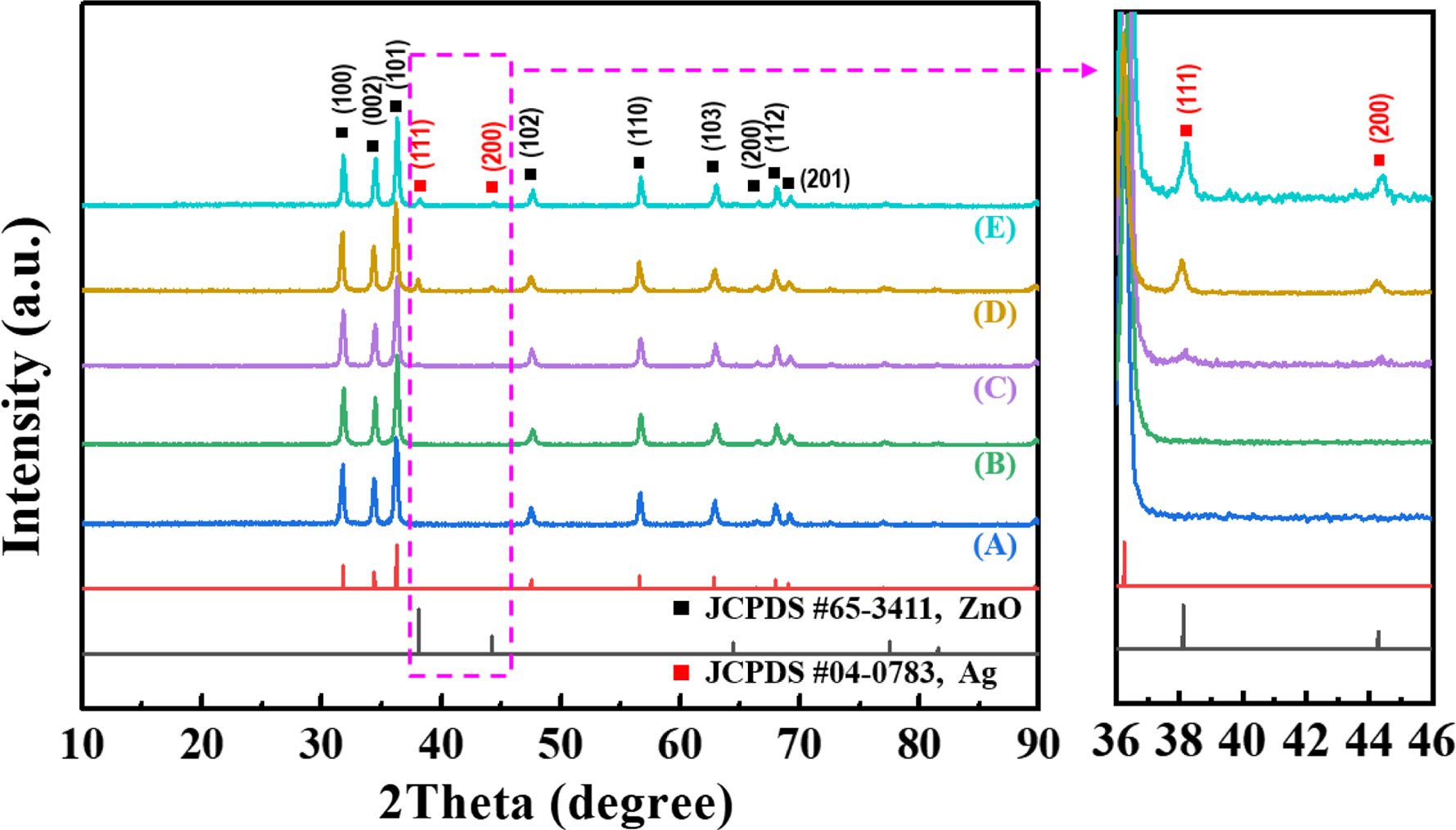 Fig. 4 X-ray diffraction (XRD) patterns of electrospun nanofibers with different Ag content: (A) ZA-0 (0 at% Ag), (B) ZA-1.0 (1.0 at% Ag), (C) ZA-1.5 (1.5 at% Ag), (D) ZA-2.0 (2.0 at% Ag), and (E) ZA-2.5 (2.5 at% Ag) |