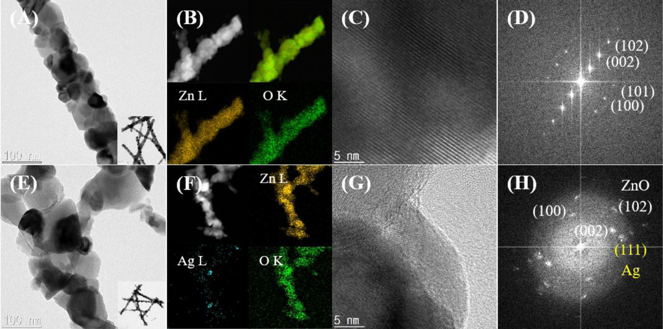 TEM analysis was performed on the ZA-0 and ZA-1.5 nanofibers to examine the Ag formation in the ZnO nanofibers, as shown in Fig. 5 in which it is clearly evident that each individual nanofiber was composed of nanoscale crystallites which were fully bonded with neighboring crystallites to form a fibrous structure. No distinct change was observed on the morphology of the ZA-1.5 nanofibers compared to ZA-0 except for the dispersion of Ag nanoparticles with a diameter of around 10 nm. EDX mapping analysis results from the TEM images of ZA-1.5 reveal the presence of Ag nanoparticles in the nanofibers; their microstructures and inter crystal junctions can be seen more clearly in the HR-TEM images in Fig. 5(C) and 5(G). Fig. 5(D) and 5(H) presents the fast Fourier transform (FFT) patterns of the HR-TEM images (Fig. 5D and 5H for Fig. 5C and 5G, respectively) which shows their high crystallinity and confirms that the transformed patterns correspond to those of hexagonal wurtzite ZnO for both the ZA-0 and ZA-1.5 nanofibers. Additionally, an extra diffraction dot can be seen in the ZA-1.5 pattern corresponding with crystalline Ag in the (111) orientation.
