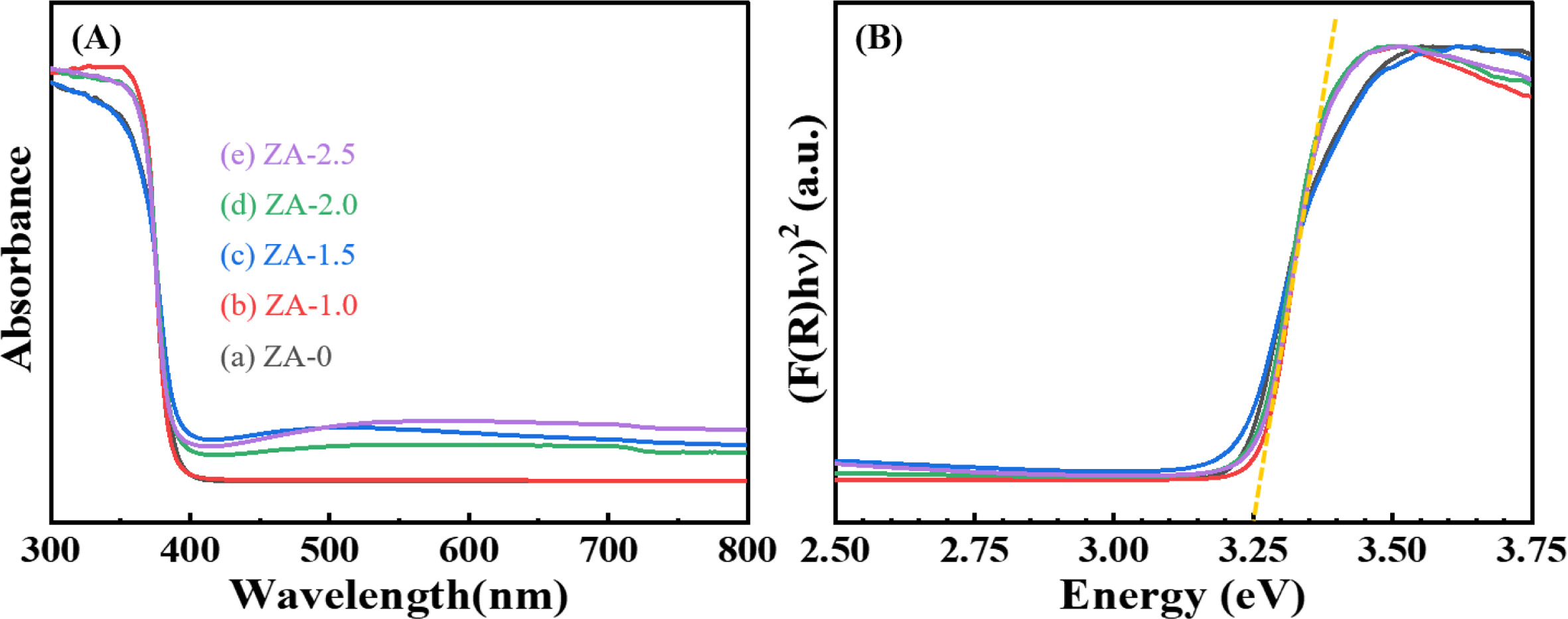 Fig. 6 (A) UV-Vis absorption spectra and (B) Kubelka-Munk plots obtained from diffuse reflectance data of the nanofibers with different Ag content: ZA-0 (0 at% Ag), ZA-1.0 (1.0 at% Ag), ZA-1.5 (1.5 at% Ag), ZA-2.0 (2.0 at% Ag), and ZA-2.5 (2.5 at% Ag). |