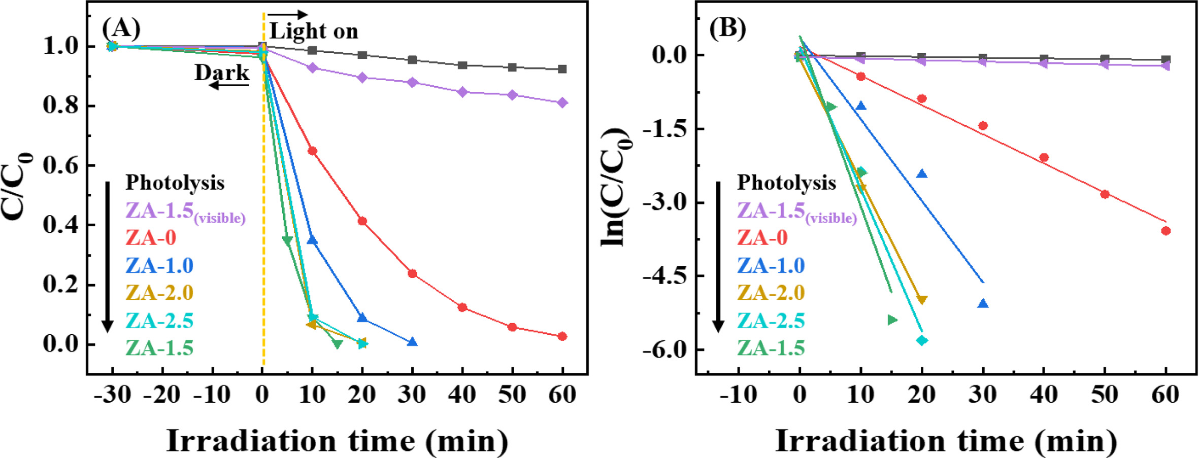 Fig. 7 (A) Kinetic profiles on photocatalytic degradation of RhB by Ag-ZnO nanofibers synthesized with different Ag content and (B) plots of ln(C/C0) versus irradiation time for the first-order rate constant: ZA-0 (0 at% Ag), ZA-1.0 (1.0 at% Ag), ZA-1.5 (1.5 at% Ag), ZA-2.0 (2.0 at% Ag), and ZA-2.5 (2.5 at% Ag). |
