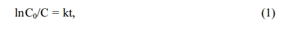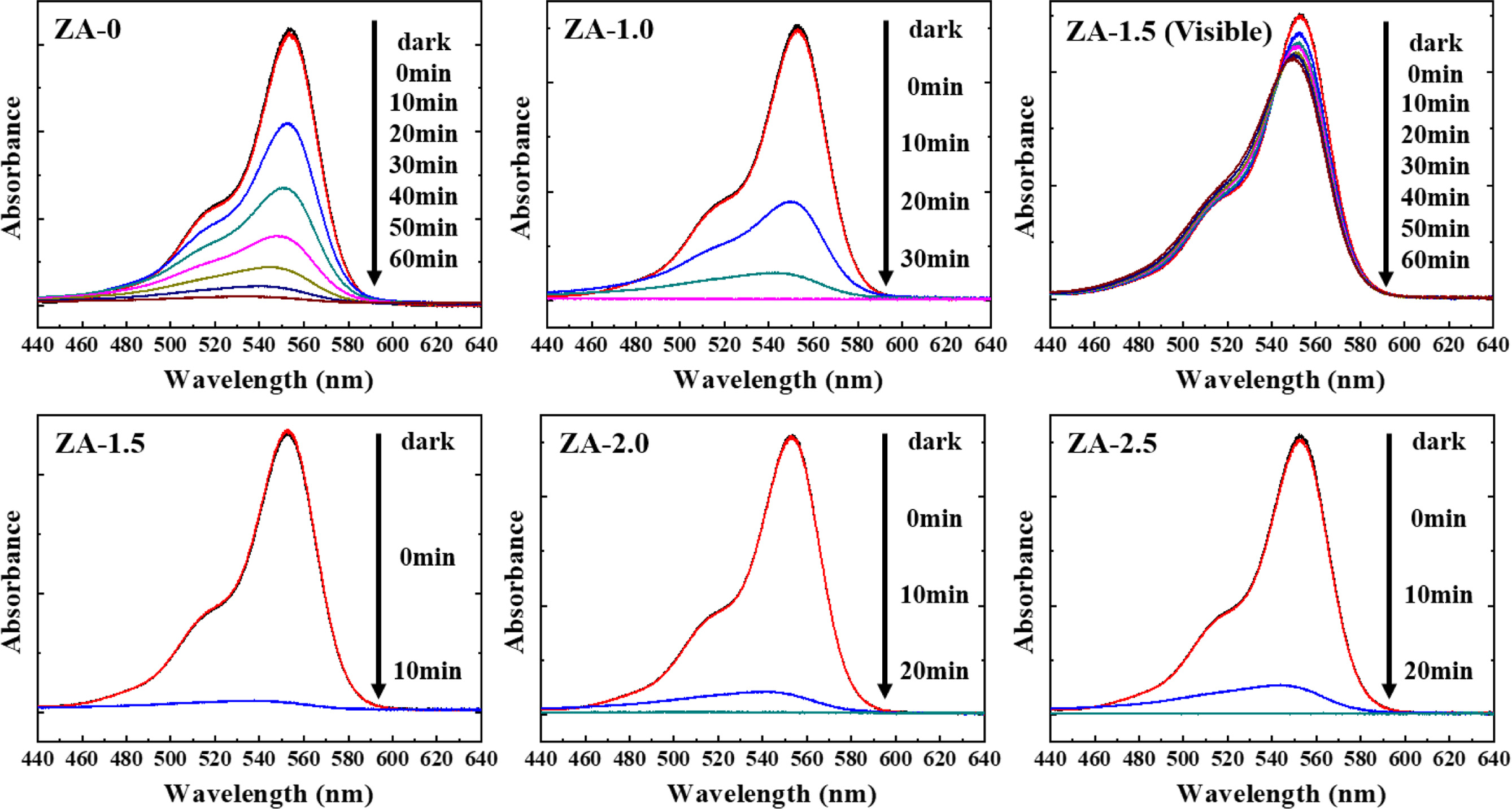 The influence of the loaded amount of Ag on the photocatalytic activity of the Ag-ZnO nanofibers was evaluated by their usage as photocatalysts. Rhodamine B (RhB), a widely used organic dye, was selected as the model pollutant to investigate the photocatalytic activity of the synthesized nanofibers. As shown in Fig. 8, the normalized optical density change of RhB at 553 nm was used to evaluate the photocatalytic activity [27, 28]. C/C0 changes over reaction time, where C0 is the original concentration of dyes and C is the concen- tration of filtrates taken during the reactions, were used to evaluate the degradation rates. Generally, the decom- position of the dye can be assigned to a pseudo-first-order kinetics reaction with a simplified Langmuir-Hinshelwood model when C0 is very small [29, 30]: