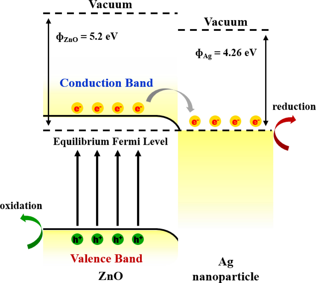 Fig. 10 Schematic diagram showing electron migration by the formation of ohmic contact in Ag/ZnO heterojunction composite. |