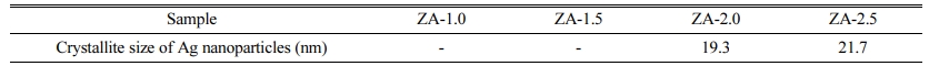 Zinc acetate [Zn(CH3COO)2·2H2O, 99%], polyvinyl pyrrolidone (PVP, Mw = 1 300 000), and silver nitrate (AgNO3, 99%) were purchased from Sigma-Aldrich (St. Louis, MO, USA) and all reagents were of analytical grade and were directly used as received without any further purification. ZnO and Ag-ZnO nanofibers were synthesized using an electrospinning method followed by a thermal treatment step. The viscous solution for the electrospinning was prepared by dissolving 0.5 g of PVP and 1.097 g of Zn(CH3COO)2 in 9.1 mL of anhydrous ethanol under vigorous stirring at a rate of 300 rpm for 1 h, thereby ensuring that all of the chemicals had dissolved. AgNO3 was mixed in the solution at levels between 1.0 and 2.5 at%. The final products without Ag and with 1.0, 1.5, 2.0, and 2.5 at% Ag were named ZA-0, ZA-1.0, ZA-1.5, ZA-2.0, and ZA-2.5, respectively. The precursor solution was transferred into a syringe attached with a 0.25 mm inner diameter needle which was placed in the front of a rotating metal collector with a fixed distance of 12 cm between the nozzle and collector. An aluminum foil-covered rotating drum acting as the cathode collector was rotated at 300 rpm during the electrospinning. The precursor solution was progressed through a syringe pump (KDS200; KD Scientific Inc., Holliston, MA, USA) controlled at a rate of 0.4 ml∙h-1 and the solution was negatively charged at 18 kV via a power supply (HV60; NanoNC Co., Ltd, Seoul, Korea) to electrify it. Environmental conditions were kept constant at 40 oC and a humidity of 20%. After the electrospinning, aluminum foil coated with the nanofibers was removed and inserted into a drying oven at 60 oC overnight and the nanofibers were calcined at 500 oC for 3 h with a heating rate of 5 oC∙min-1 in the air for polymer removal and crystallization of ZnO and Ag.