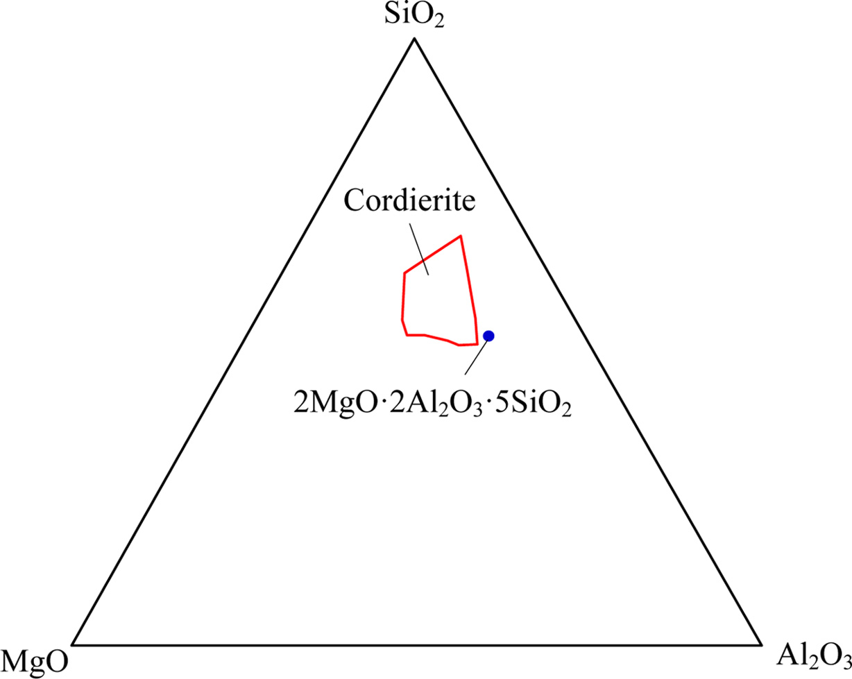 For the cordierite system in reported literatures [29-30], the SiO2-MgO-Al2O3 ternary phase diagram was determined, as shown in Fig. 1. In this study, the molar ratio of SiO2, MgO and Al2O3 were controlled at 5 : 2 : 2 to guarantee the crystallizing of cordierite.