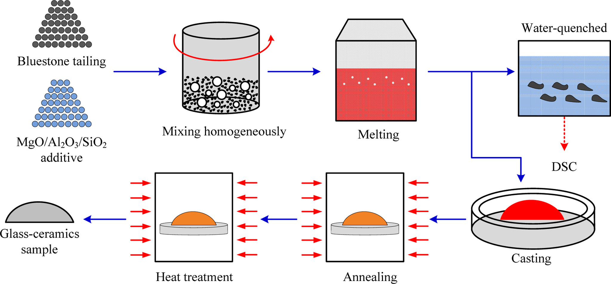 Fig. 2 Schematic diagram of cordierite glass-ceramics preparation process based on bluestone tailing. |
