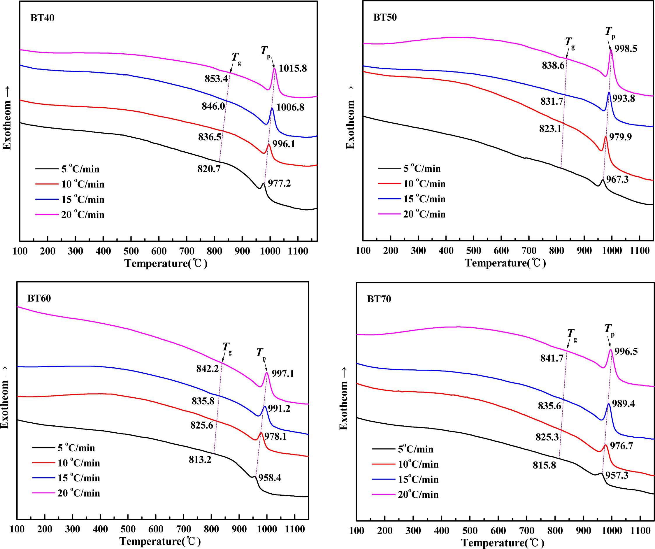 Fig. 3 DSC curves of the parent glass samples BT40-BT70 at various heating rates |