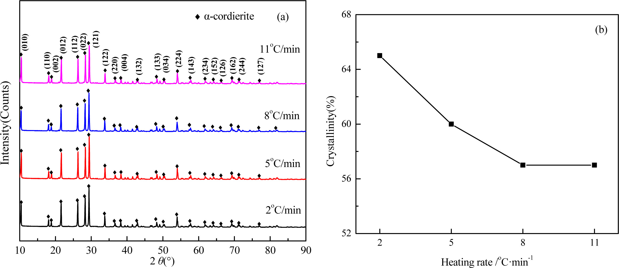 The XRD patterns and crystallinity of the glass-ceramics with different heating rate are shown in Fig. 7. As shown in Fig. 7(a), the main crystal phases with the different heating rate are α-cordierite, and with enhancing the heating rate, the diffraction peaks of α-cordierite decreased slightly at the crystal orientation of (121), and (022), which indicates the enhancing of heating rate could restrain the precipitation and growth of α-cordierite crystals. The crystallinities of the samples, as shown in Fig. 7(b), decreased from 65% to 57% with lowering the heating rate from 11 oC·min-1 to 2 oC·min-1. This is because a lower heating rate indicates a longer crystal growth time, thereby facilitating the crystallization ability.