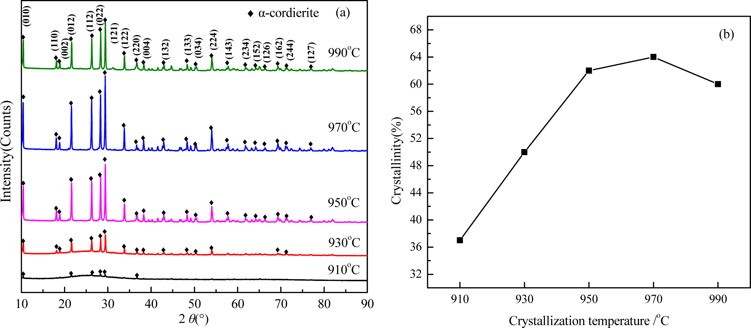 With increasing the crystallization temperature from 910 oC to 970 oC, the diffraction peaks of α-cordierite increased obviously at the crystal orientation of (010), (012), (112), (121), and (022), which indicates the enhancing of crystallization temperature could promote the precipitation and growth of α-cordierite crystals effectively. Correspondingly, the crystallinity increased and reached the maximum value 64% at 970 oC, as shown in Fig. 9(b). With further increasing the tem- perature to 990oC, the crystallinity decreased slightly, which is mainly caused by the remelting of some crystals at this temperature.