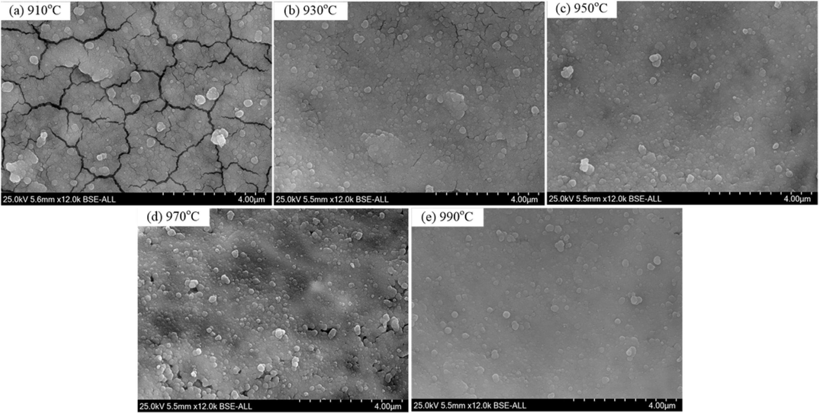 Fig. 10 shows the microstructures of the glass-ceramic samples prepared at different crystallization temperature. As shown in Fig. 10(a), a lot of cracks appeared in the glass-ceramics, which could be attributed to the following reasons. (1) With a crystallization temperature of 910 oC, the crystallinity was relatively low and large amounts glass phases existed. In the cooling process, the different expansion properties between glass phases and crystal phases would result in the internal stress and produce fine cracks. (2) To observe the crystals in glass-ceramics, the samples were chemically etched for 3-5 s in a 4 vol % HF, which would dissolve the glass phase and promote the cracks growth further. With increasing the crystallization temperature, the crystallinity increased and the cracks gradually disappeared. With increasing the crystallization temperature to 990 oC, the crystal grain edges became blurred, which indicates that the remelting of crystal grains occurred gradually. As a result, the crystallinity of glass-ceramics reduced slightly. Therefore, considering the crystallinity and microstructures of the glass-ceramics, the recommended crystallization temperature is 970 oC.