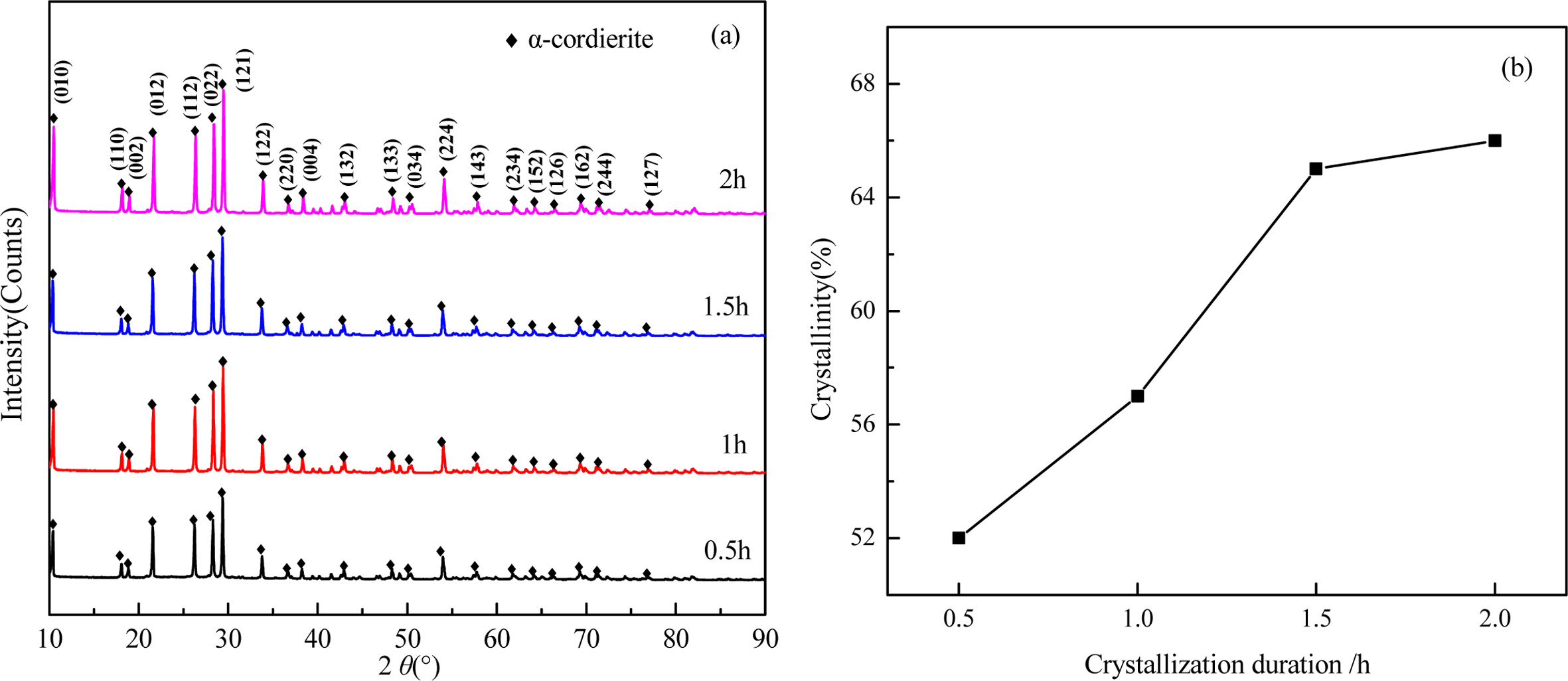 Fig. 11 shows the XRD patterns and crystallinity of the glass-ceramics with different crystallization duration. It can be seen that the main components in the glass-ceramics is α-cordierite. With the increase of crystallization duration, the diffraction peaks of α-cordierite increased at the crystal orientation of (010), (012), (112), (121), and (022). This indicates the increase of crystallization duration could promote the precipitation and growth of α-cordierite crystals obviously. Simultaneously, the calculated crystallinity increased obviously from 52% to 65% with increasing the crystallization duration from 0.5 h to 1.5 h, and then increased slightly to 66% with further increasing the crystallization duration to 2.0h. This indicates that the increasing of crystallization duration could facilitate the crystallization of bluestone tailing glass-ceramics. Fully considering the crystallinity tendency and the energy consumption, the selected crystallization duration is 1.5 h.