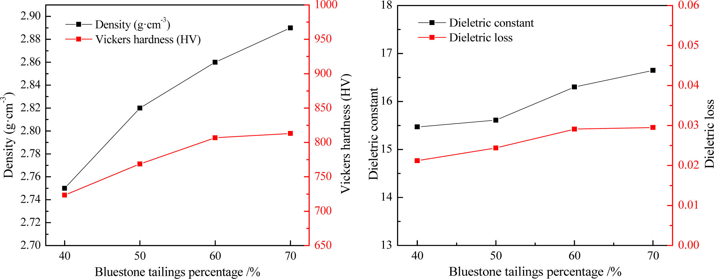 The glass-ceramics sample prepared with different bluestone tailings under a heating rate of 5 oC·min-1, a crystallization duration of 1.5 h, a crystallization tem- perature of 970 oC, a nucleation temperature of 830 oC and a nucleation duration of 1.0 h were used for properties testing. The density, Vickers hardness, and dielectric loss of the glass-ceramic sample were tested, and the results are shown in Fig. 14. It can be seen that the density and Vickers hardness are increased with enhancing the bluestone tailings percentage. This may be related to the improved crystallinity and grain refinement and homogenization. With a bluestone tailings percentage of 70%, the density and the Vickers hardness are 2.89 g·cm-3 and 813.23 HV, which are similar to those for cordierite-based glass-ceramics as obtained from the previous research [5]. The dielectric properties, including dielectric constant and dielectric loss, were tested at a frequency of 10MHz. As shown in Fig. 14, the dielectric constant and dielectric loss increased slightly with increasing the bluestone tailings percentage. The dielectric constant and dielectric loss are mainly ranging from 15 to 17 and 0.01 to 0.03 and obviously higher than that in the reported researches [11], which is mainly caused by the higher alkali metals content (K2O, Na2O, Fe2O3) in the bluestone tailings.