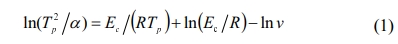 where α is the heating rate (K/s), R is the gas constant (8.314 J·mol-1·K-1), Ec is the activation energy of crystallization (J·mol-1), and ν is the pre-exponential factor.