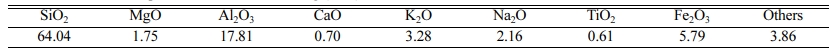 The bluestone tailing used in this study was taken from a stone processing plant in Jiangxi, China, and its chemical compositions are listed in Table 1. The main components of the bluestone tailing are SiO2, Al2O3, Fe2O3, K2O and Na2O. The sum of the SiO2, MgO and Al2O3 content is more than 83%, and the sum of Fe2O3, K2O and Na2O content is up to 10.20%. In general, the SiO2, MgO and Al2O3 are the main components of cordierite, and the Fe2O3 is widely used as nucleating agent in glass-ceramics preparation [26-28]. Besides, the introducing of alkali metal oxide in glass-ceramics could also decrease the viscosity of melted glass and the crystallization temperature. Therefore, it is suitable to apply the bluestone tailing as the main raw materials to prepare cordierite glass-ceramics.