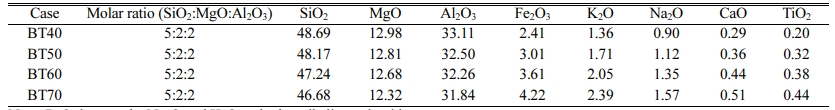 Table 2 Mass percentage of different raw materials used in the cordierite glass-ceramics preparation (wt%) |