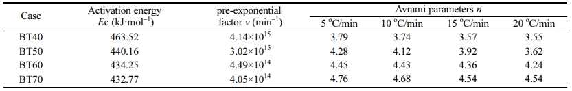 Fig. 4 shows the plot of ln(Tp2/α) versus 10000/Tp at different bluestone tailings percentages. The activation energy Ec and pre-exponential factor v could be calculated by the slope Ec/R and intercept (ln(Ec/R)-lnv) of the fitted line in Fig. 2. The Avrami parameters n is employed as an interpretation of the crystallization mechanism [31], and it can be calculated from the Augis-Bennett equation [32-33] as follows: