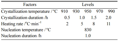 Based on the abovementioned bluestone tailings per- centage, nucleation temperature and nucleation duration, the heat treatment parameters were optimized by single-factors experiments. The detailed levels of the selected factors, including crystallization temperature, crystallization duration, and heating rate, are listed in Table 6.