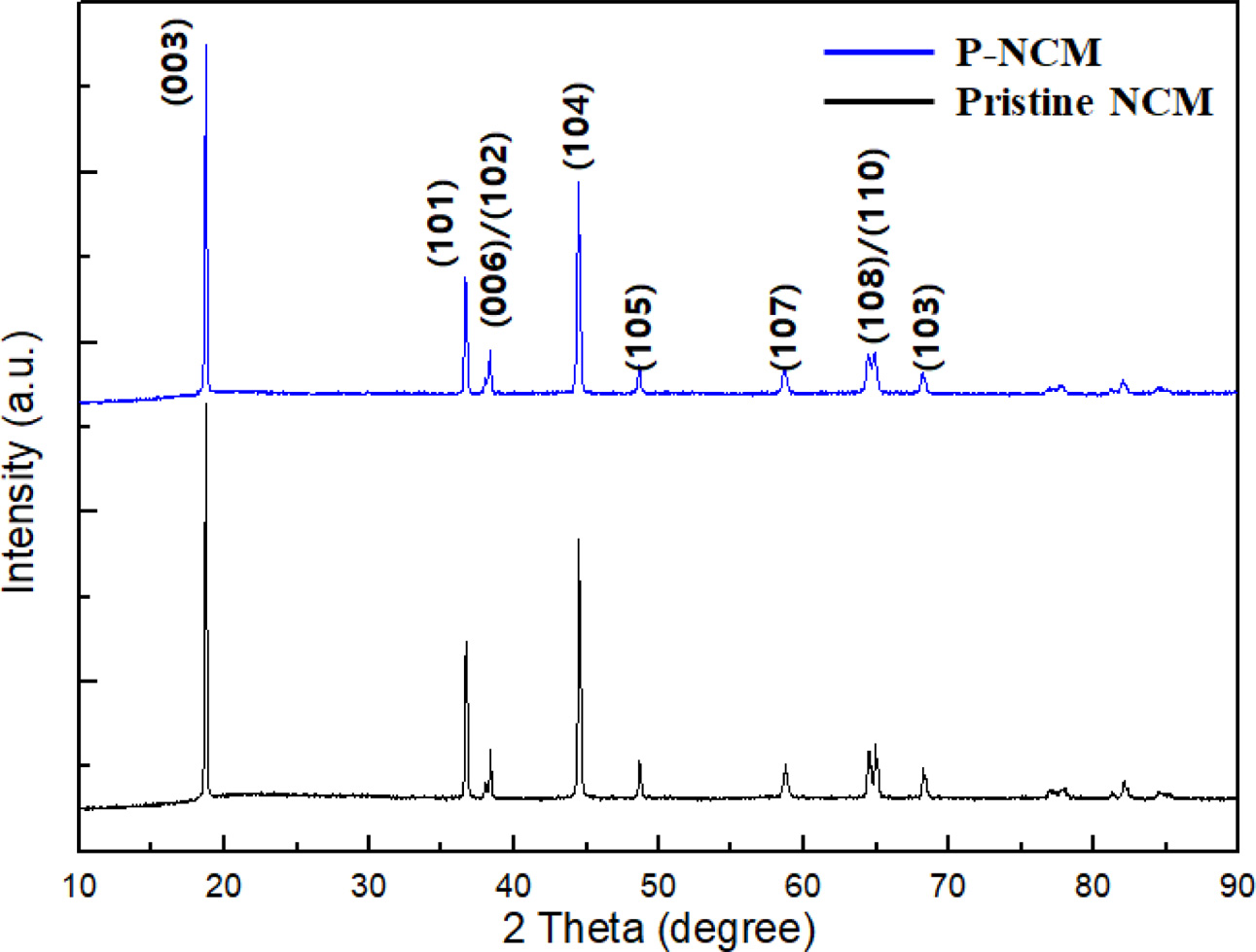Fig. 1 XRD patterns of pristine NCM and P-NCM.. |