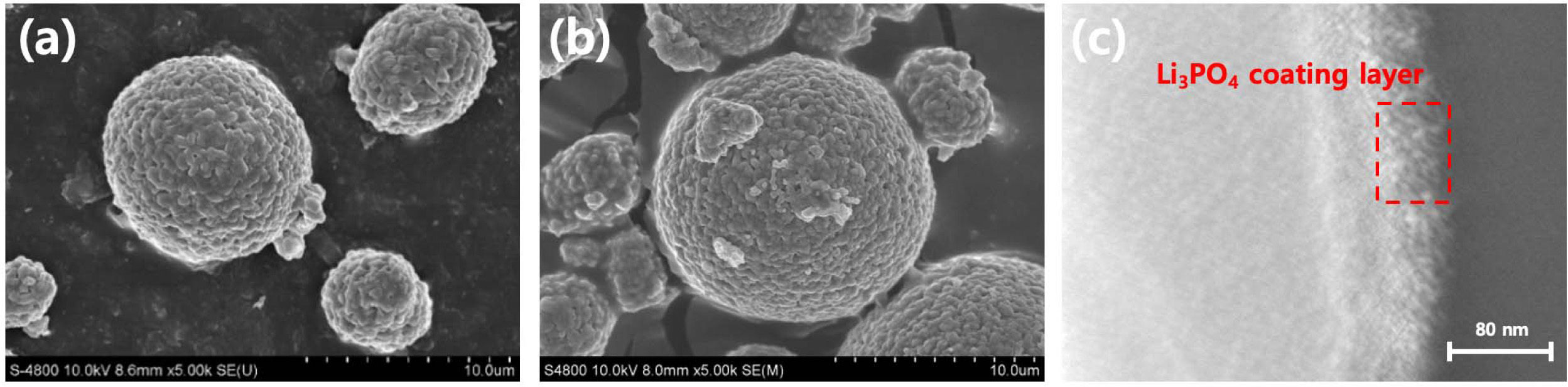 The FE-SEM images of pristine NCM and P-NCM powder can be observed in Fig. 2(a) and (b). It can be seen that both samples have a similar spherical shape with a diameter of 8-15 μm composed of primary particles with an average size of 150-200 nm. Overall, there are no significant changes between the surface shape of pristine NCM (Fig. 2(a)) and P-NCM (Fig. 2(b)). However, the surface morphology of P-NCM exhibits a somewhat rough surface morphology compared to that of pristine NCM, which is clean and smooth. Furthermore, the presence of Li3PO4 is proven by TEM, as shown in Fig. 2(c). It can be shown that the Li3PO4 coating layer has a thickness of about 60 nm. Therefore, we can confirm that the Li3PO4 is successfully coated over the NCM particle.