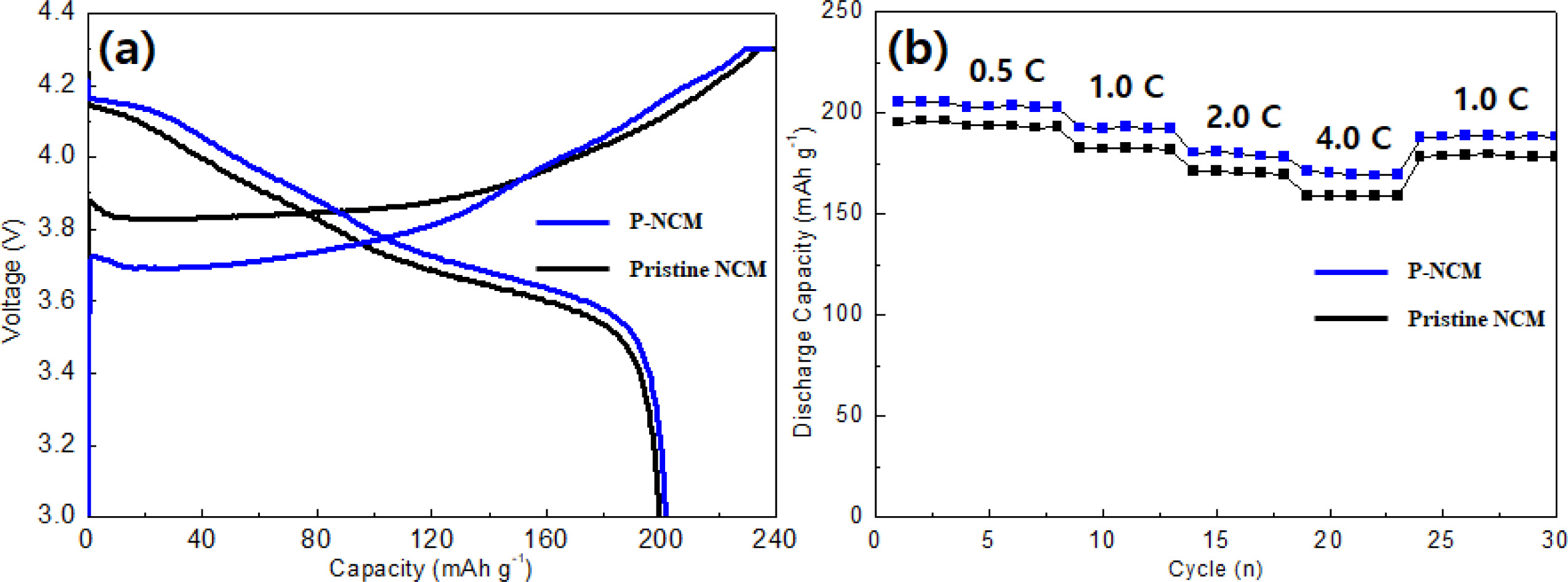 Fig. 3 Charge-discharge curves (a) and rate capability (b) of pristine NCM and P-NCM at different C-rates (0.5 C, 1.0 C, 2.0 C and 4.0 C). |