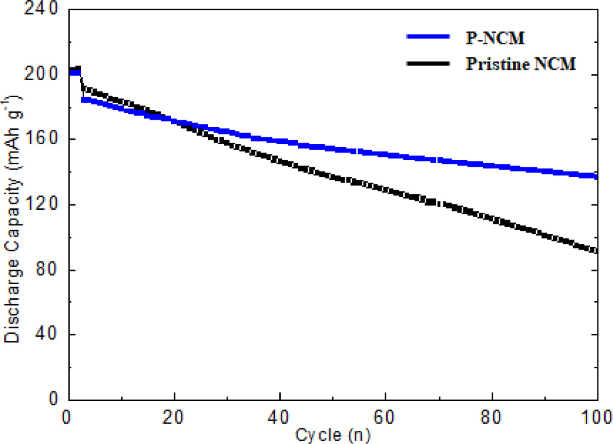 Fig. 4 Cycle performance of pristine NCM and P-NCM. |