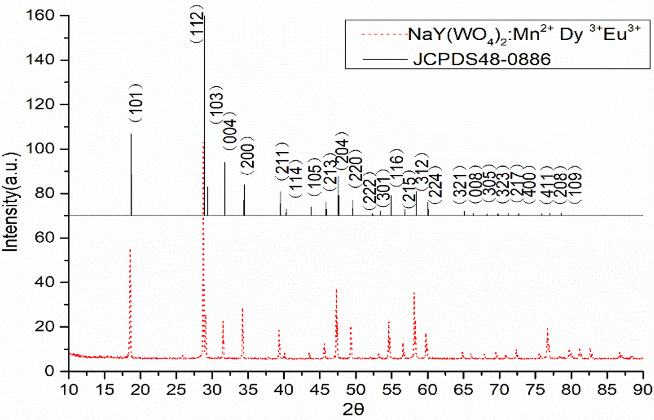 From the Fig. 1, we can conclude that doping trivalent ions (Mn2+, Dy3+, Eu3+) into the host NaY(WO4)2 will keep single phase and the doping process and the dopant concentration is the studied concentration region do not affect the structural properties of pure NaY(WO4)2.