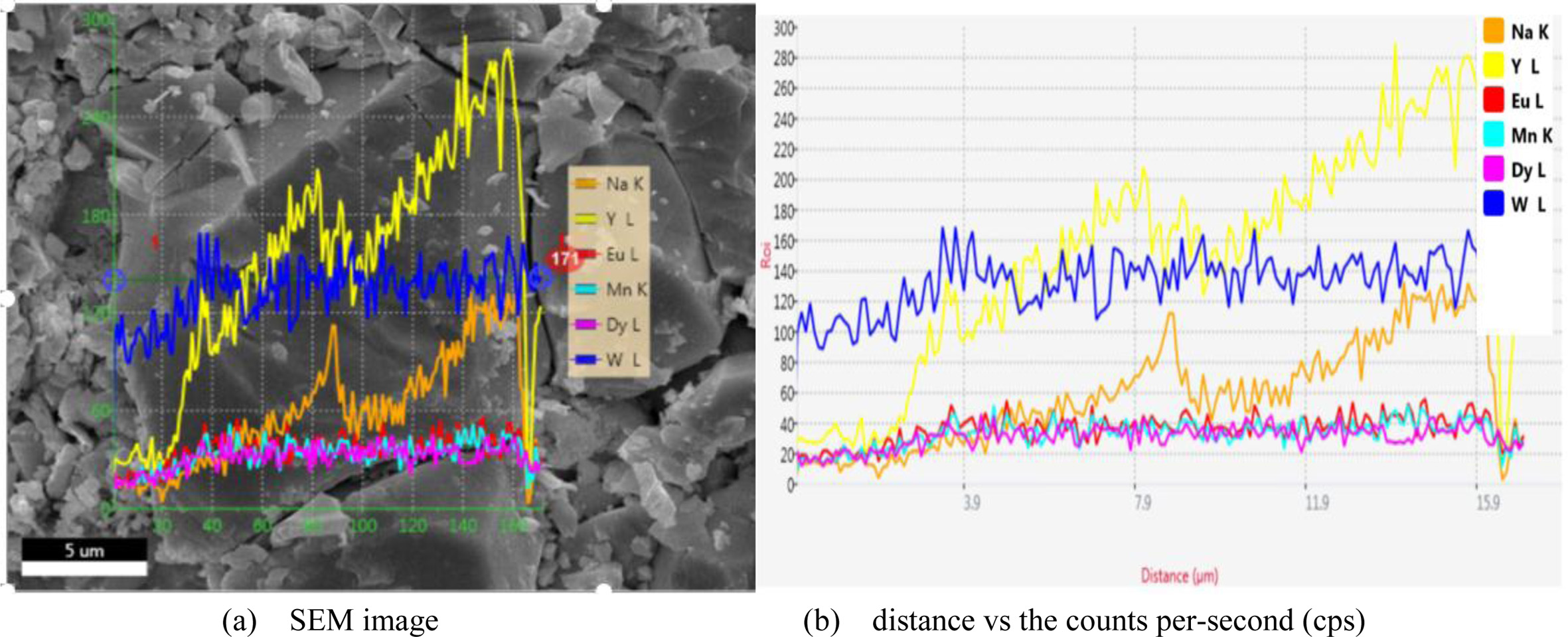 The morphology of the NaY(WO4)2:xMn2+, yDy3+, zEu3+ (x = 4 at%; y = 4 at%; z = 4 at%) phosphors calcined at 800 oC is showed in Fig. 2(a). The measurement in the Fig. 2(a) is 5 um. It can be seen from the Fig. 2(a) that the sample is powdery and uniformly distributed. The size is 1-2 um. SEM showed that we successfully prepared our samples. Through the change of CPS, it can be seen that the sample is evenly distributed in the longer size range of 15 um. The line-EDS spectra were dealt with the maximum 15 KV voltage and 16 μm length. scanning distance vs counts per-second is showed in Fig. 2(b). SEM images exhibit distorted spherical and rectangular sharp. Almost unchanged morphology are observed. This fact illustrates that the doped ions at the present level does not destroy the initial micro-crystal structure, and the stable NaY(WO4)2 microstructures can be reproducibly obtain. the sample keeps still pure single crystal phase.
