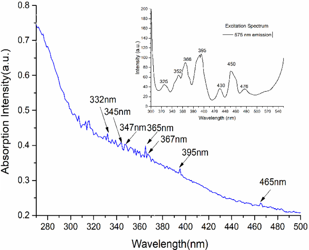 Fig. 3 The absorption spectra of NaY(WO4)2: xMn2+, yDy3+, zEu3+ (x = 6 at%; y = 4 at%; z = 4 at%) phosphors; excitation spectrum with 575 nm emission is at the upper. |