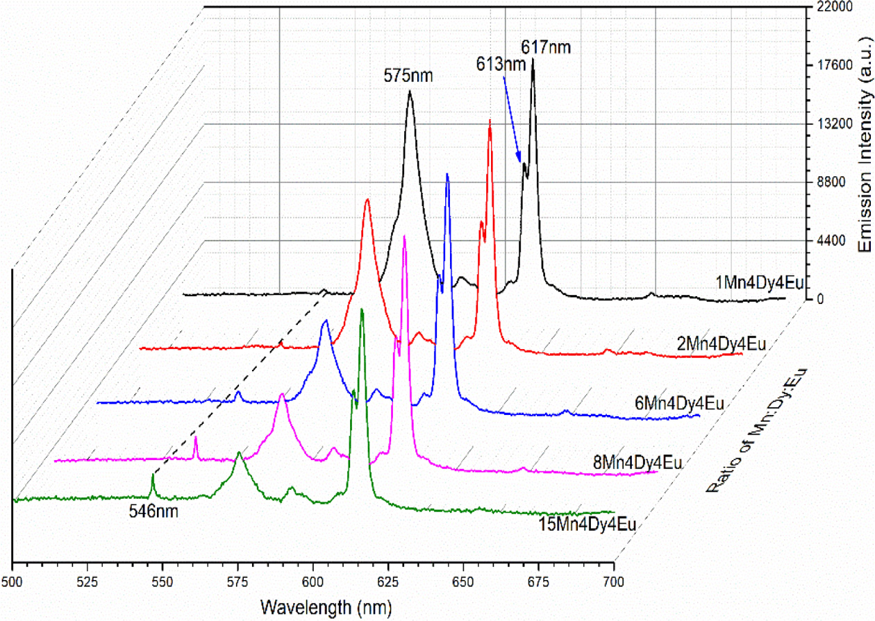 The excitation source is used with the 365 nm LED, the emission spectra are shown in Fig. 4. Three emission peaks center at 546 nm (4T2→6A1 (Mn2+)), 575 nm (4F9/2→6H13/2 (Dy3+)), 613 nm-617 nm (5D0→7F0 (Eu3+)) are observed. In order to facilitate comparison, the 617nm emission light peak intensity is used as a fixed value for comparison. With the increasing doped con- centration of Mn2+, the emission intensity of 546 nm (4T2→6A1 (Mn2+)) becomes stronger. With the decreasing doped concentration of Mn2+, the emission intensity of 575 nm (4F9/2 → 6H13/2 (Dy3+)) becomes stronger. The Mn2+ doping reduces the emission intensity of Dy3+, mainly the reason is that the energy absorbed by Dy3+ is transferred to Mn2+. The main energy transfer way is resonance transmission. And so, we can obtain the tunable green-yellow-red emission with the concentration ratio of Mn2+ to Dy3+ and Eu3++, which contributes to the broad application field such as display, health and plant growth.