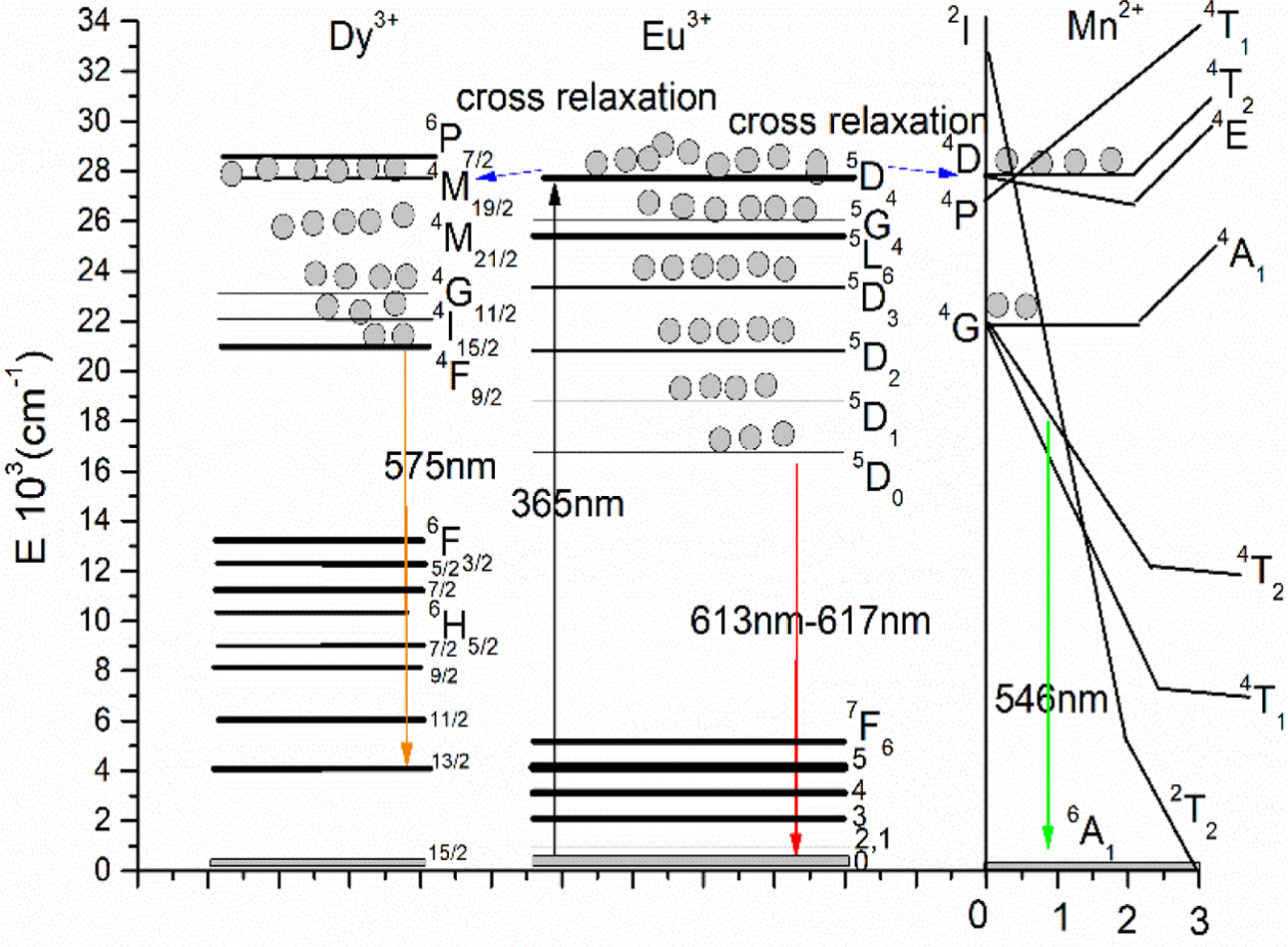 From emission spectra it is obtained that the Mn2+, Dy3+, Eu3+ tri-doped in NaY(WO4)2 have meaningful influence on the tunable green-yellow-red LED. The energy levels of Mn2+, Dy3+, Eu3+ are shown in Fig. 5. With 365 nm exciting, the electrons are inspired to 5D4(Eu3+), and then transit from the 5D4 (Eu3+) to 5G4(Eu3+), 5L6 (Eu3+), 5D3(Eu3+), 5D3(Eu3+), 5D2(Eu3+), 5D1(Eu3+), 5D0(Eu3+) by the non-radiation transition. Finally, the electrons will move to the lower energy level of 5D0(Eu3+) to generate 613-617 nm red emission. The 4D (Mn2+) and 4P(Mn2+) energy levels is near, which are all close to the energy level 5D4 (Eu3+). Also the energy level 5D4(Eu3+) is higher than the 4D (Mn2+) and 4P(Mn2+), which make some of the electrons of Eu3+ transit from the 5D4(Eu3+) to 4D (Mn2+) and 4P(Mn2+) by the cross relaxation. The electrons will continue transit from 4D(Mn2+), 4P(Mn2+) to 4G(Mn2+), the green 546 nm can be obtained corresponding to the transition of 4T2(Mn2+) → 6A1(Mn2+). Energy level of 4G(Mn2+) is close to 4F9/2 (Dy3+), which will enhance the emission from 4F9/2 (Dy3+) to 6H13/2 (Dy3+), the 575 nm yellow emission. The energy level 5D4(Eu3+) is also higher than the 4M19/2 (Dy3+), which make some of the electrons of Eu3+ transit from the 5D4 (Eu3+) to 4M19/2 (Dy3+) by the cross relaxation. The electrons transit from the 4M19/2 (Dy3+)4 to M21/2 (Dy3+),4G11/2 (Dy3+), 4I15/2 (Dy3+), 4F9/2 (Dy3+) by the non-radiation transition. Finally, the electrons will transit from 4F9/2 (Dy3+) to 6H13/2 (Dy3+) to generate the 575 nm yellow light.