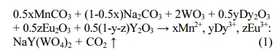 Power samples of NaY(WO4)2:xMn2+, yDy3+, zEu3+ (x = 1, 2, 6, 8, 15 at%; y = 4 at%; z = 4 at%) phosphors were fabricated via a solid state reaction method. The starting materials are MnCO3 (99.99%, 0.5-1 μm), Na2CO3 (99.995%, 0.2-0.5 μm), Eu2O3 (99.99%, 0.5-1 μm), Y2O3 (99.99%, 0.5-1 μm), Dy2O3 (99.99%, 0.5-1 μm), WO3 (99.98%, 0.1-0.5 μm). The reaction equation is as follows: