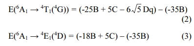 Using the Tanabe-Sugano (T-S) theory [25], the energy levels of 3d5 ions is determined by the parameters of Dq, B and C. Dq is the strength of the octahedral crystal field, B and C are Racah parameters. The values of Dq, B and C are determined by the observed peaks of 4T1 (4G), 4T1(4P), and 6A1 states, whose equations are shown as follows [26].