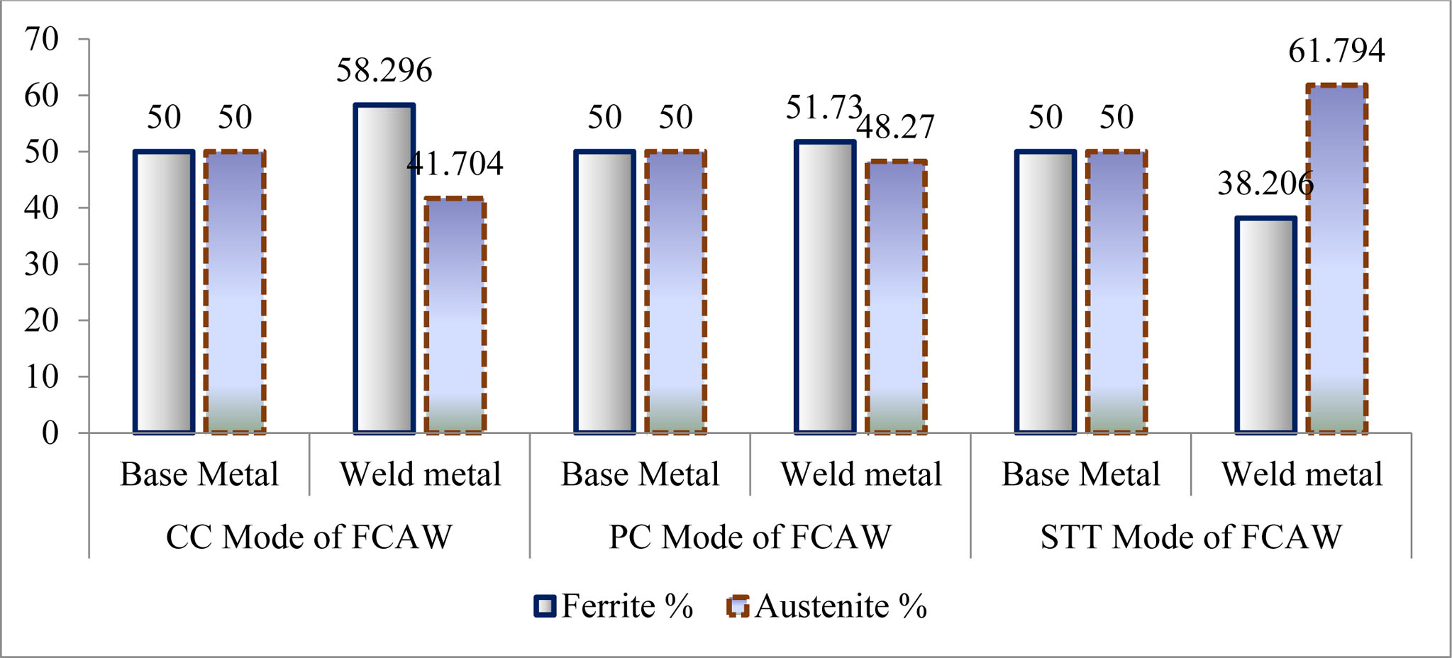 Fig. 4 Ferrite – Austenite Ratio of Various Modes of FCAW. |