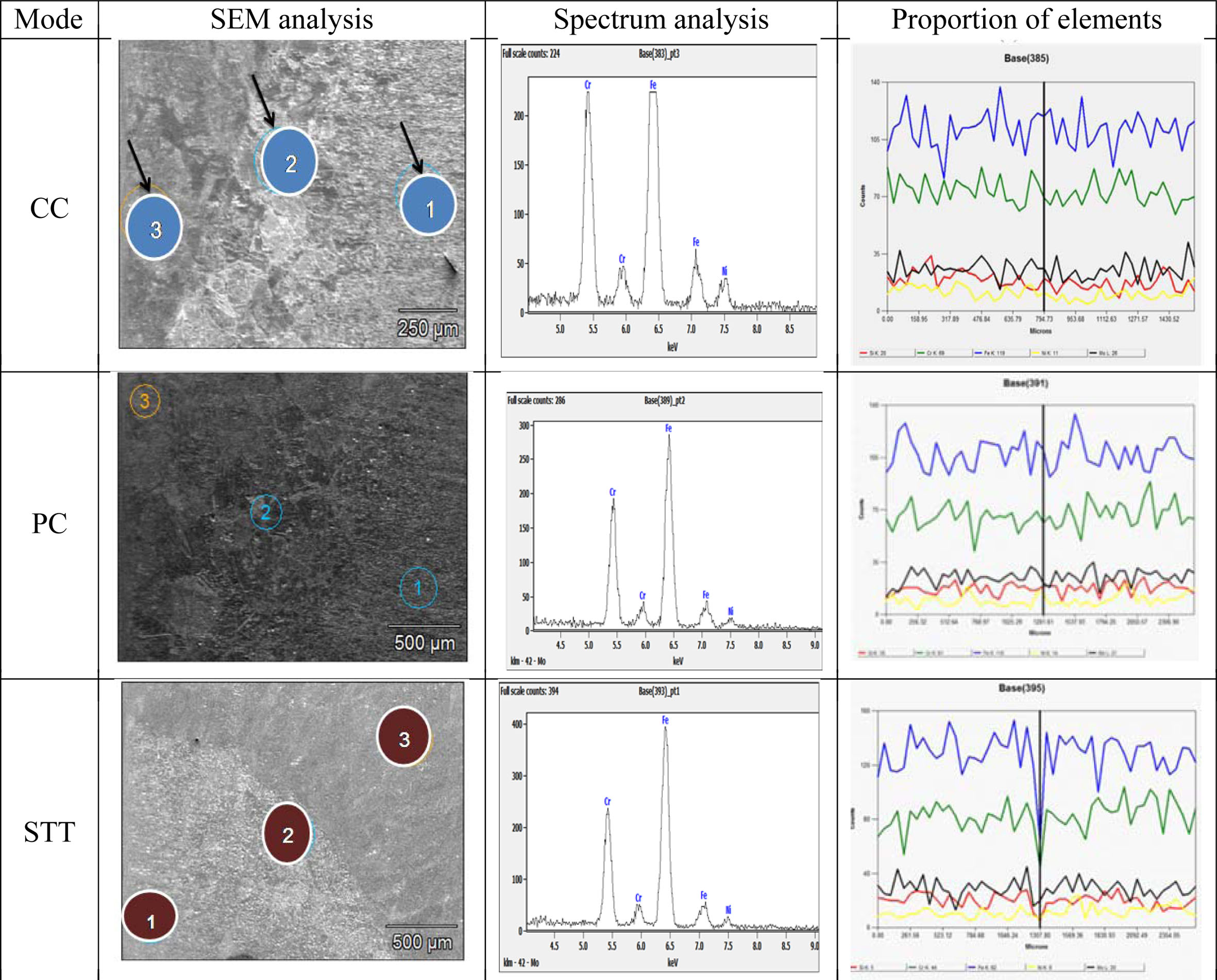 SEM and EDAX analysis of CC, PC and STT mode