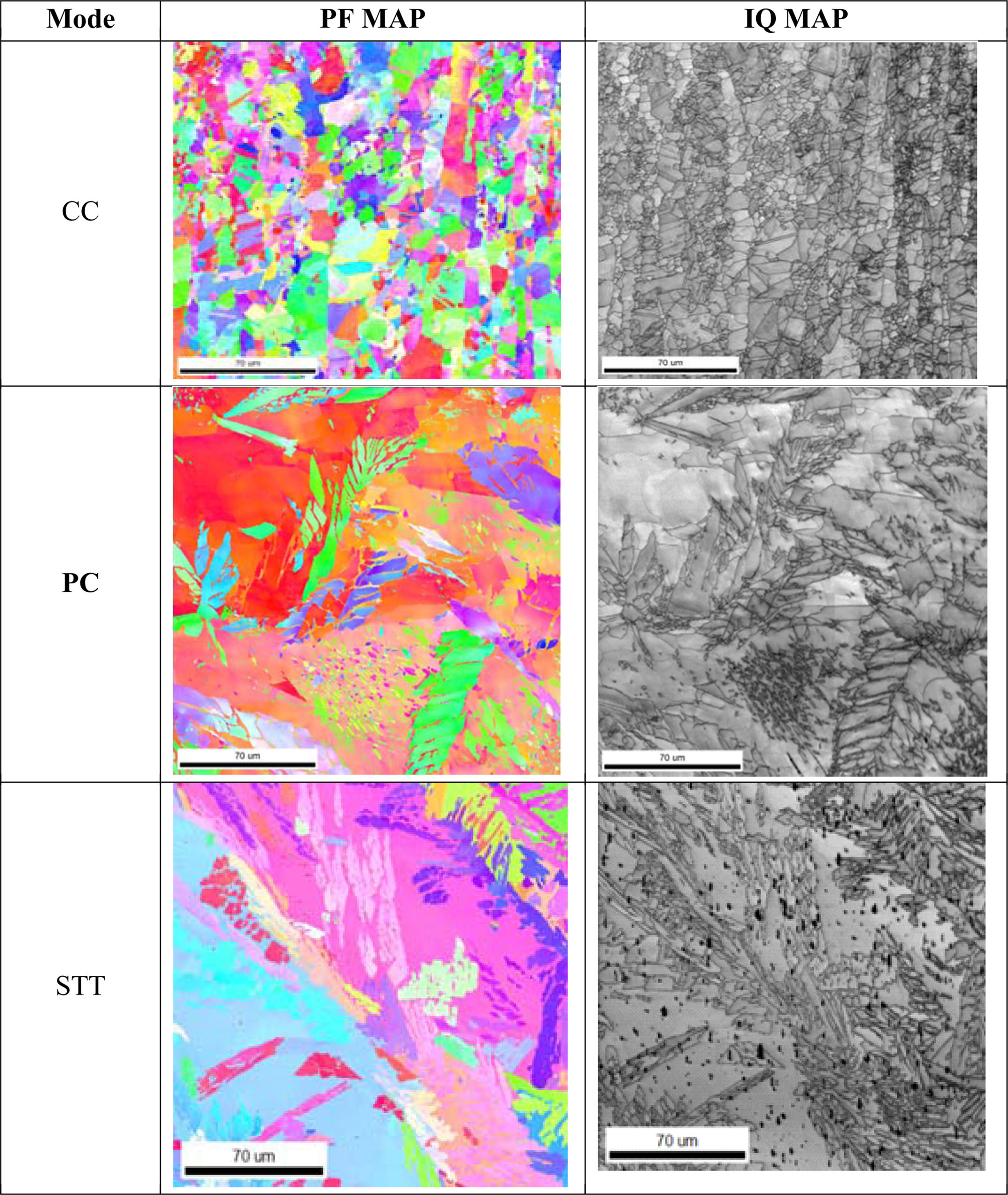 Fig. 8 IPF MAP and IQ MAP for various modes of FCAW using EBSD |