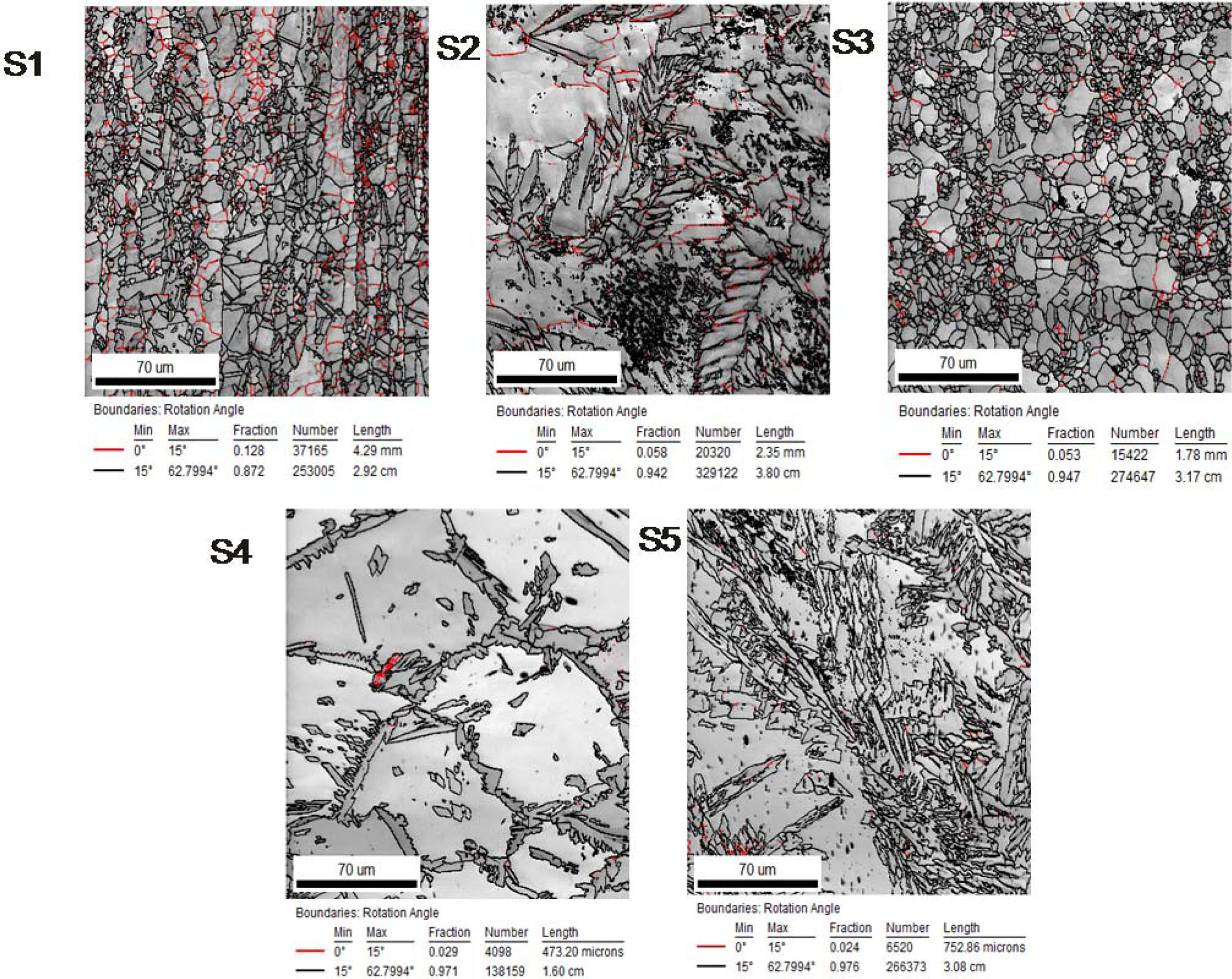 A better ferrite-austenite ratio is observed in sample 3 and sample 5. That is, with STT mode in EBSD. The low and high angle boundaries fraction of samples is shown in Fig. 9.