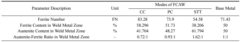 The ferrite content in the base metal is equal to the austenite content forming the rest of the microstructure. It is observed that the ferrite percentage of 30 to 60% is maintained in the WZ of all the considered modes. The ferrite content in CC mode is 58.296% greater than PC mode and STT mode. Increasing the heat input further may initiate crack in CC mode. A proper cooling rate is needed for austenite formation. However the ferrite content percentage in STT mode is less than PC mode, with PC mode having ferrite content of 51.73% in the WZ. Thus the ratio is maintained near to 1:1 in case of pulsed current mode. In the case of STT mode the ferrite content is very much lower than the austenite. A further variation of heat cycle may reduce the corrosion resistance in STT mode. Thus, in terms of ferrite measurement and corresponding ratio measurement, the pulsed current mode provides better results.