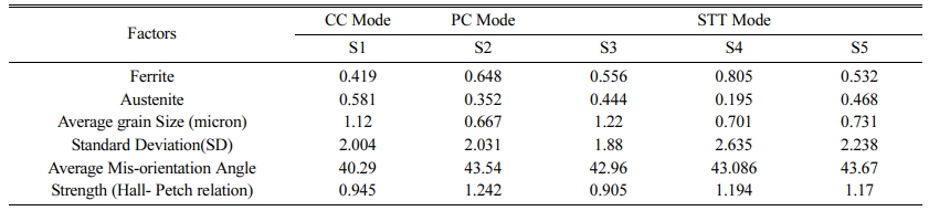 In this work, a point pair (grain) with mis-orientation angle more than 2 degrees is considered as boundary. The results of EBSD analysis in terms of grain size is given in Table 7. The ferrite-austenite fraction identified using EBSD for various modes are depicted in Fig. 10.