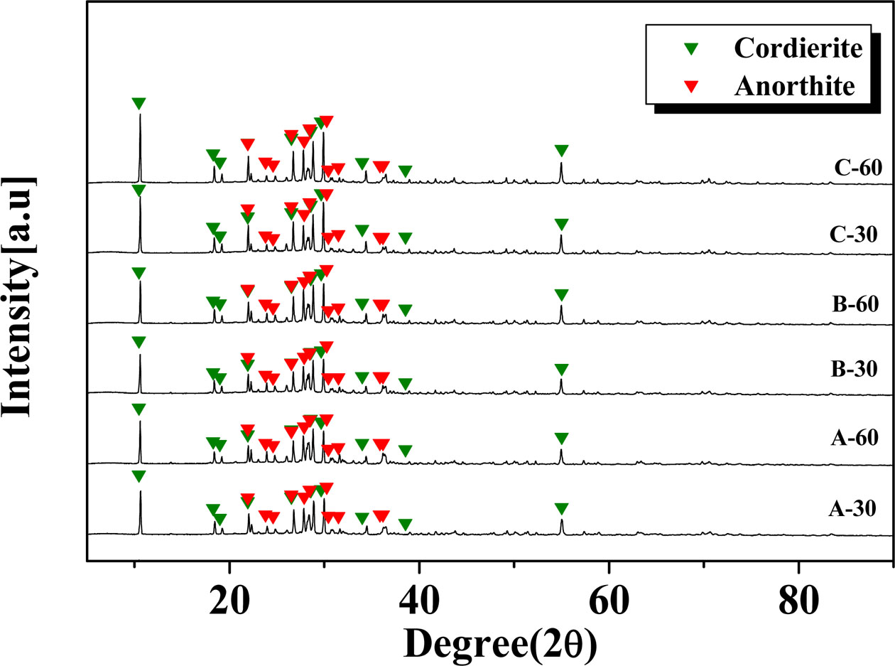 Fig. 2 shows the XRD patterns of the glazes obtained under various heat-treatment conditions (temperature range of 1000–1100 oC and a holding time of 30 or 60 min). Glass–ceramic glazes with cordierite (Mg2Al4Si5O18) and anorthite (CaAl2Si2O8) crystalline phases were observed under all heat-treatment conditions. In addition, the peak intensity of the cordierite crystalline phase increased with increasing heat-treatment temperature. According to Tabit et al., ceramics composed of cordierite and anorthite crystalline phases exhibit high mechanical strength, and mechanical strength was improved with larger amounts of cordierite in the crystalline phase [16].