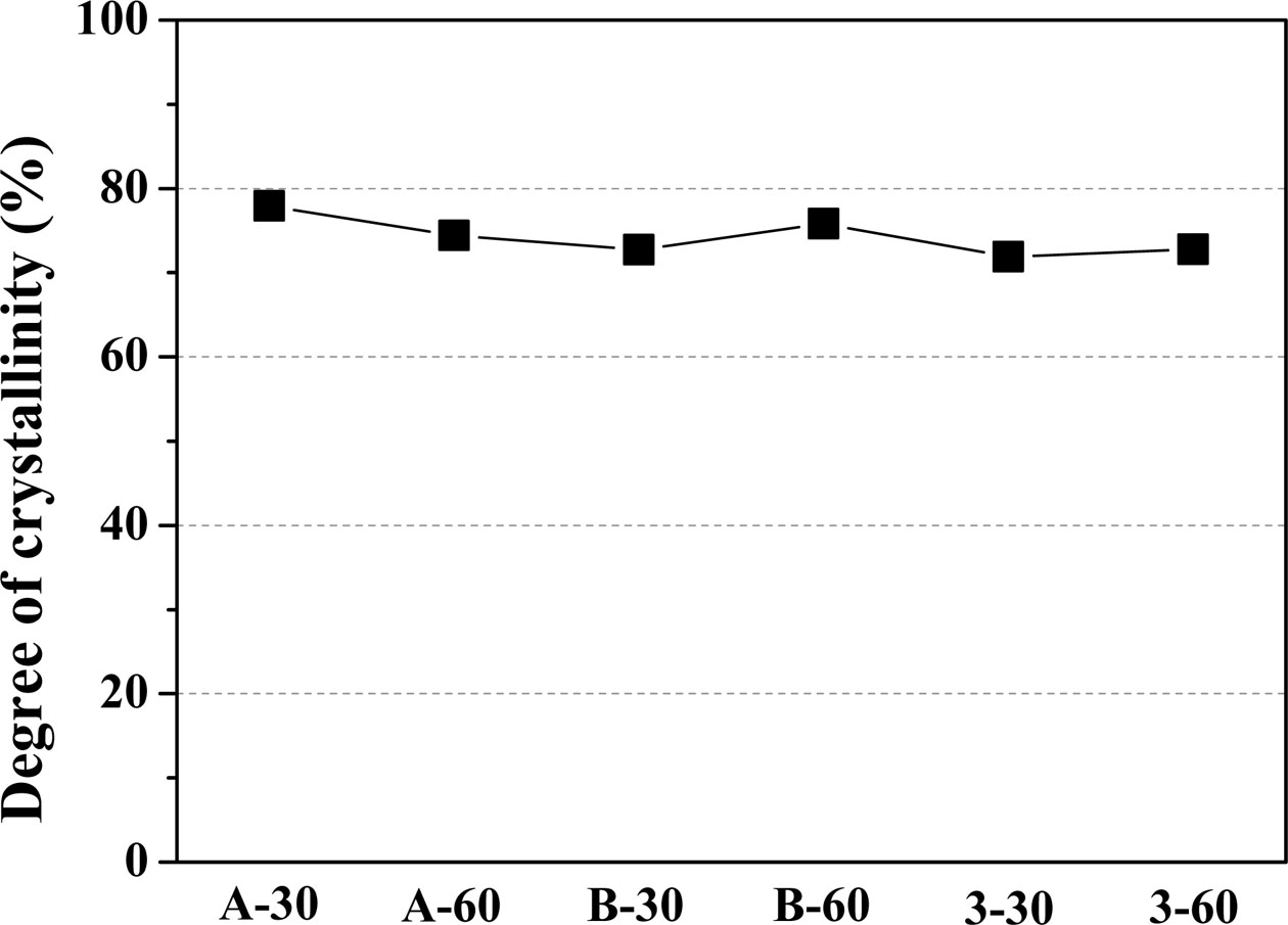 Fig. 3 shows the degree of crystallinity of the glass–ceramic glaze heat-treated for 30, 60 min at the temperature of 1000 oC~1100 oC. At a 30 min holding time, increasing the heat-treatment temperature from 1000 oC to 1100 oC resulted in a decrease in the degree of crystallinity of the glaze from 77.9% to 71.9%. At the longer holding time (60 min), the degree of crystallinity progressed from 74.4% to 75.8% and 72.8% with increasing heat-treatment temperature. The glazes showed a high degree of crystallinity (>70%), regardless of the heat-treatment conditions.