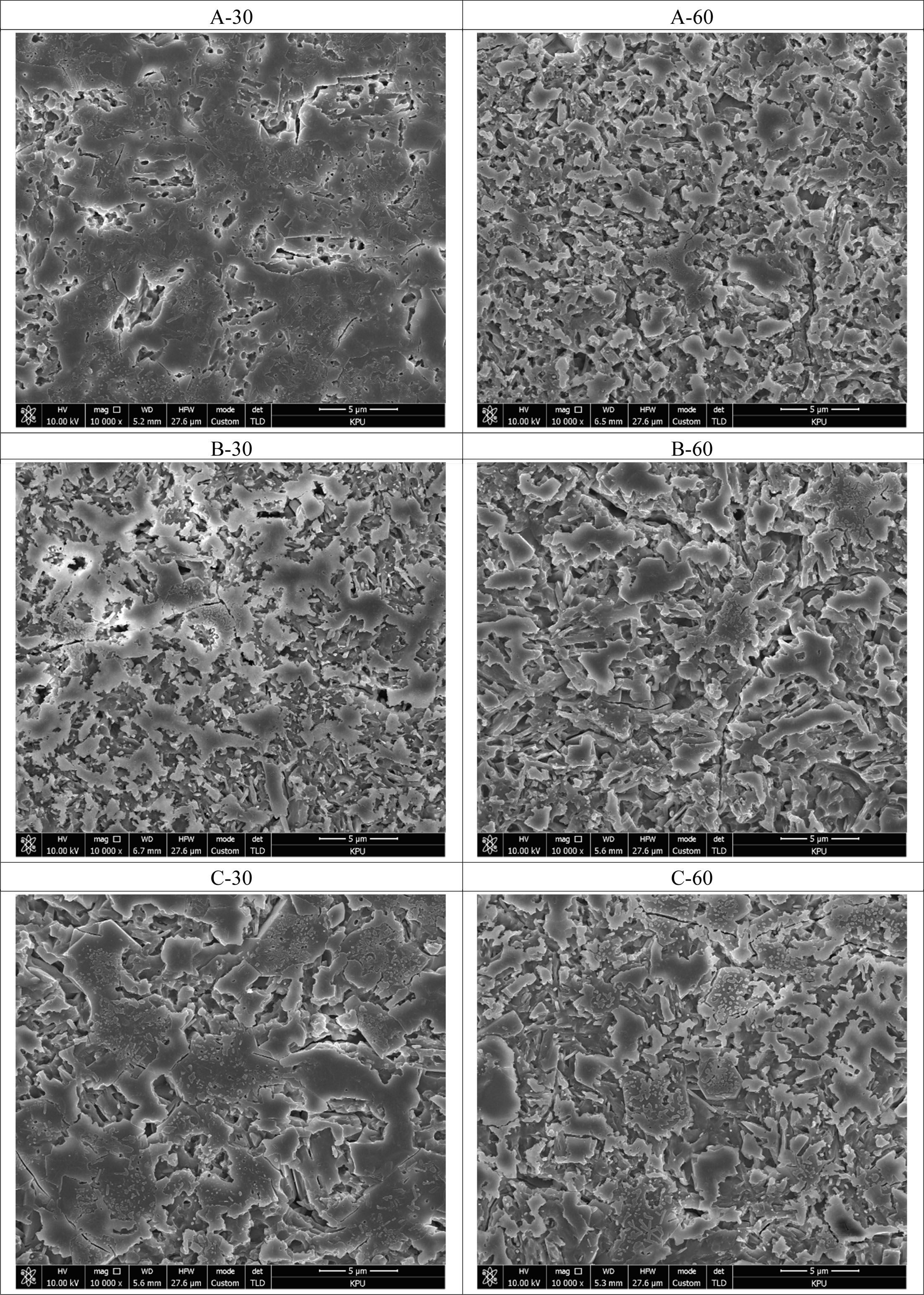 Fig. 5 shows the SEM images of the surface micro- structure of the glass–ceramic glaze that were heat-treated for 30, 60 min at the temperature of 1000 oC ~1100 oC. The surface of the glaze heat-treated for 30 min at 1000 oC had a denser structure than those of other glazes, and minute surface cracks were observed at the heat-treatment temperatures of 1100 oC and above.