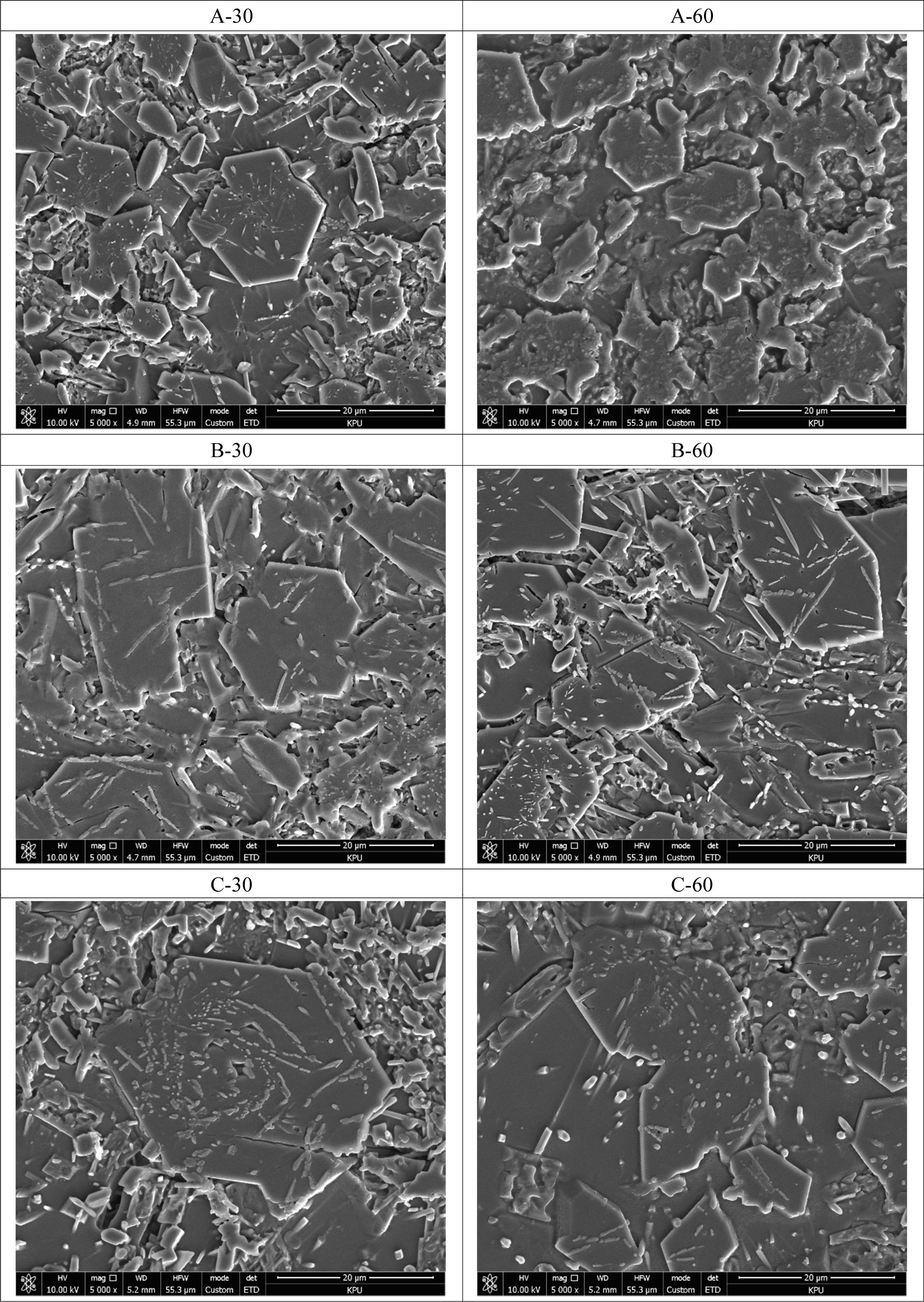 Fig. 6 shows the SEM images of the fracture surface of the glass–ceramic glazes heat-treated for 30, 60 min at the temperature of 1000 oC~1100 oC. Under all heat-treatment conditions investigated, hexagonal and rod-like crystalline phases were observed, with sizes ranging from a few to several tens of micrometers. The size of the hexagonal crystalline phase increased with increasing heat-treatment temperature. Under the maximum tem- perature studied (1100 oC), the glaze microstructure exhibited cracks that traversed the crystalline phase; these cracks were observed irrespective of holding time. As reported by Apel et al., crack propagation in glass–ceramic glazes occurs through the glass matrix and the crystalline phase with the crack terminating in the region where the density of the crystalline increases [17]. Cracks are considered to be caused by the abnormal contraction and expansion of the glaze because the heat-treatment temperature exceeds that at which the glaze exhibits plastic behavior [18].