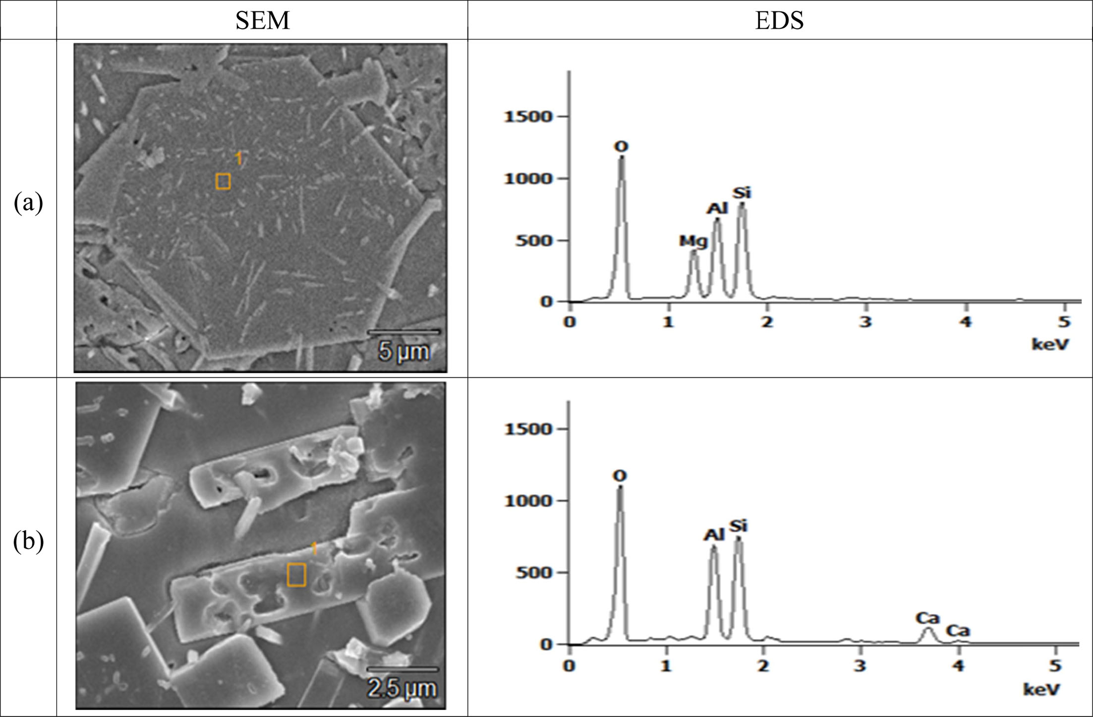 Fig. 7 shows the quantitative analysis results of the hexagonal and rod-shaped crystal phases observed by SEM/EDS. The hexagonal crystal phase (a) was identified as the cordierite (Mg2Al4Si5O18) crystal phase, as determined by the following elemental contents: Mg, 8.6 wt%; Al, 16.5 wt%; Si, 28.2 wt%; and O, 46.7 wt%. The rod-shaped crystal phase (b) was identified as an anorthite (CaAl2Si2O8) crystal phase, according to the following components: Ca, 11.6 wt%; Al, 11.9 wt%; Si, 17.9 wt%; and O 64.1 wt%.